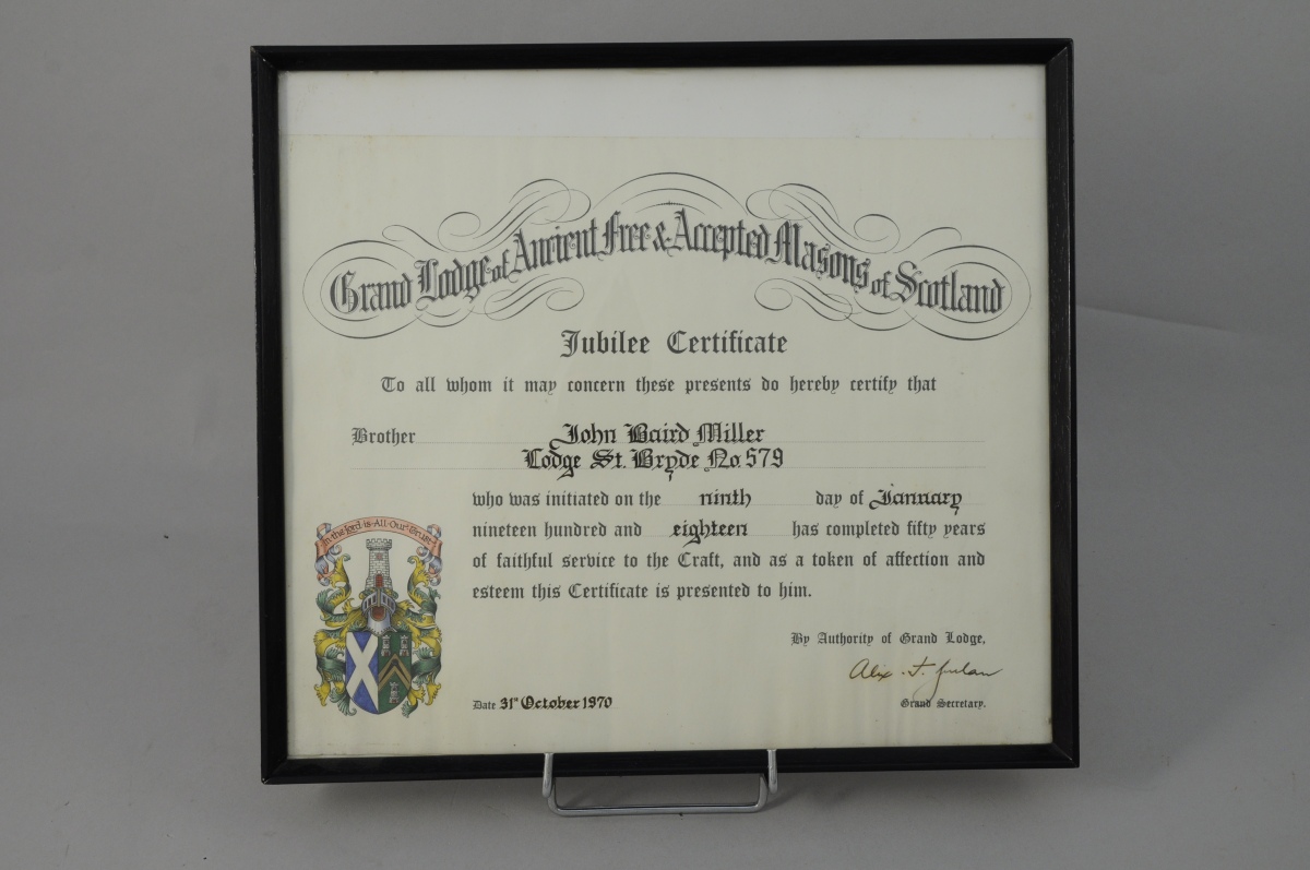 Joint : un certificat de jubilée de la loge Saint Bryde de la Grande Loge du rite ancien, libre et accepté d'Écosse, décerné à John BAIRD MILLER, le 31 octobre 1970. N°579. Dans un cadre en bois peint. 25,3 x 31 cm.
