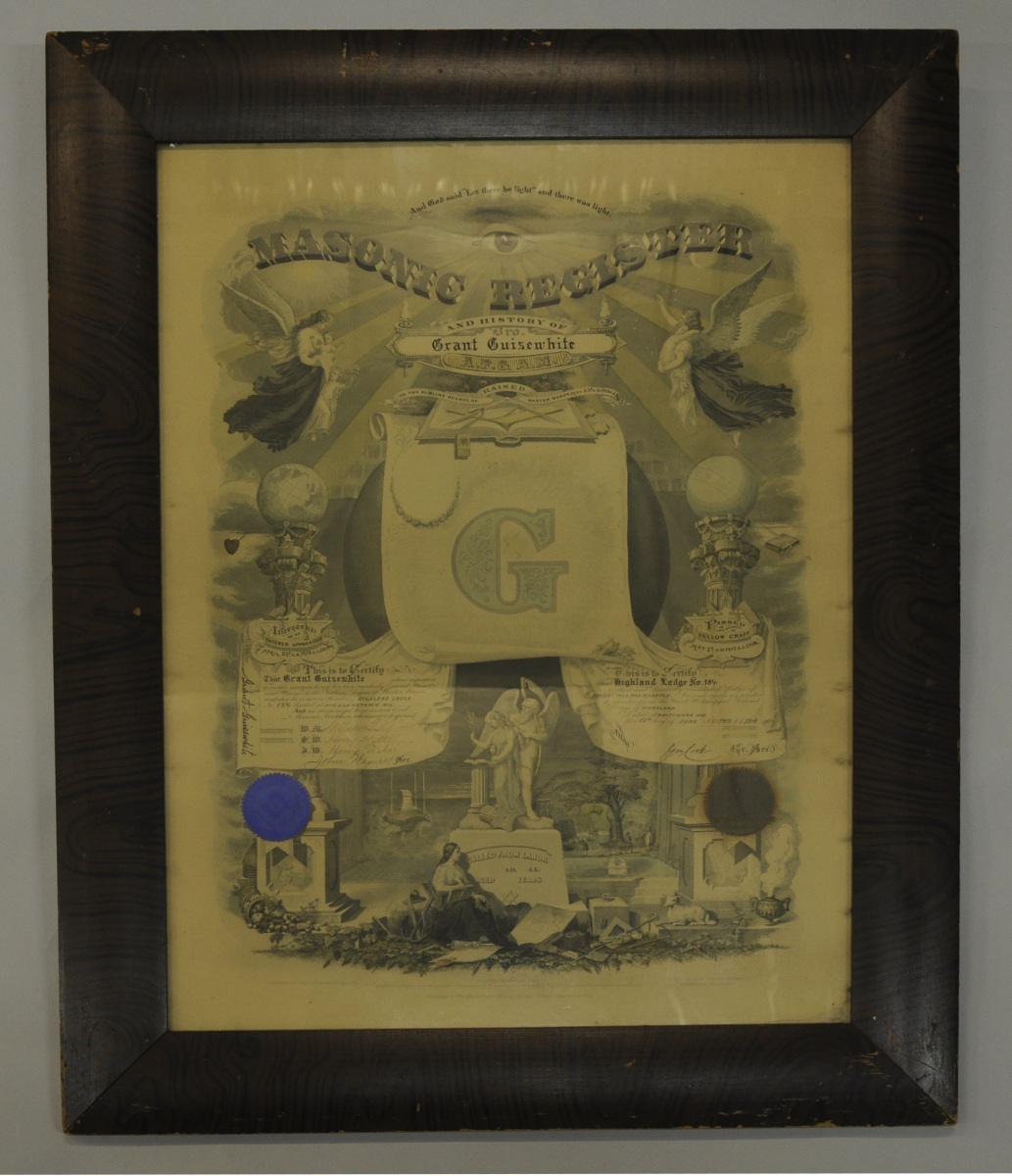DIPLÔME de MAÎTRE de la loge du Maryland, n°184 du Grand Orient américain, décerné à Grant GUISEWHITE le 23 mai 1919. 49,5 x 65 cm.