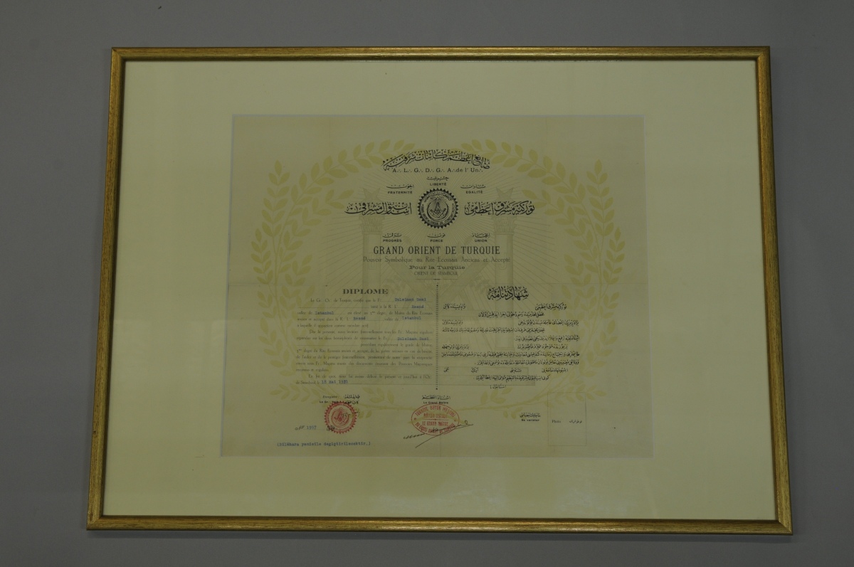 DIPLÔME de MAÎTRE de la loge Resné du Grand Orient de Turquie. Décerné à Suleiman SAMI, le 18 mai 1931 à Istamboul. N°1957. Dans un cadre en bois doré. 45 x 37 cm.