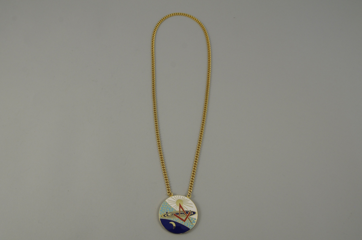 MÉDAILLE en métal doré et émaillé polychrome de la Grande Loge Nationale Française. Décor représentant le système solaire ainsi que le compas et l'équerre. Marquée au revers "G.N.L.F / L'UNIVERS / 231 / Consacrée le 28 Mars 1979 / 01 / R.E.A.A ". Chaîne en métal doré. XXème. Diam. 54 mm.