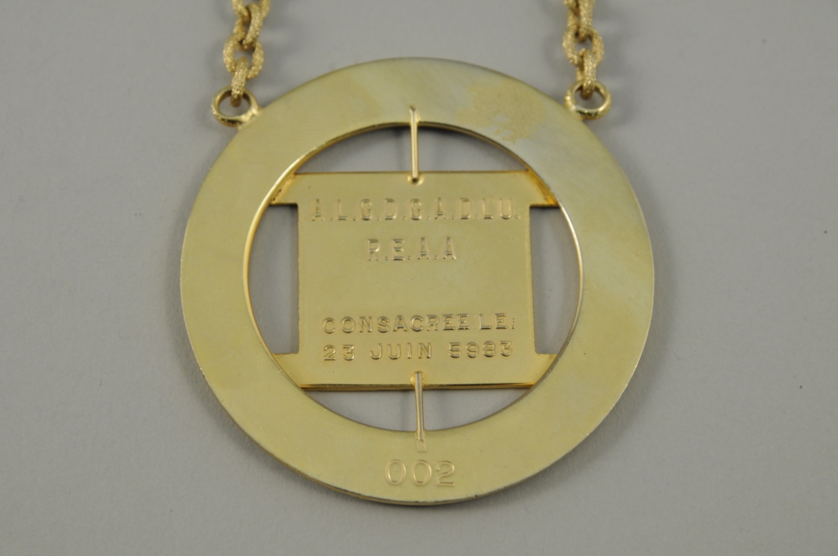 MÉDAILLE en métal doré et émaillé rouge et noir de la Grande Loge Nationale Française. Décor ajouré d'un carré marqué "ÉRASME" et "ÉRASME 338 / G.N.L.F"sur le bord. Marquée au revers " A.L.G.D.D.G.A.D.L'U. / R.E.A.A / Consacrée le / 23 JUIN 5983 / 002". Chaîne en métal doré. XXème. Diam. 67 mm.