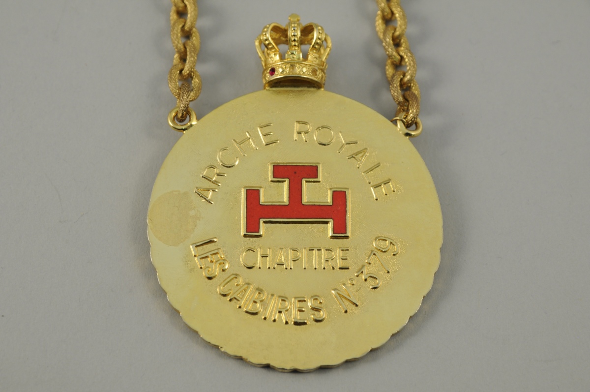 MÉDAILLE en métal doré et émaillée rouge, sommée d'une couronne ornée de petites pierres de couleur rose de l'Arche Royale. Décor représentant un arc en ciel, la mer et un ciel étoilé orientés ainsi que des attributs maçonniques. Marquée au revers " ARCHE ROYALE / GHAPITRE / LES CABIRES N° 379" et ornée de l'emblème de la loge. Chaîne en métal doré. XXème. Diam. 60 mm.