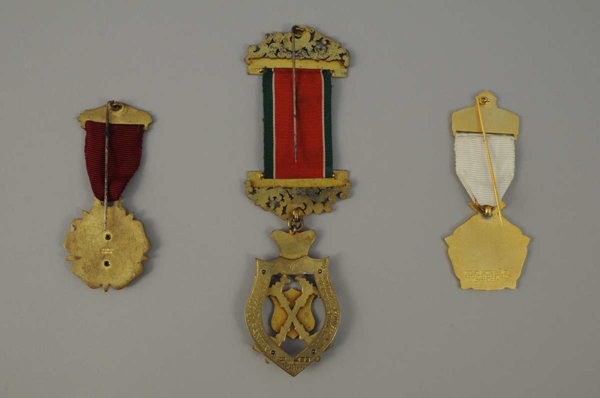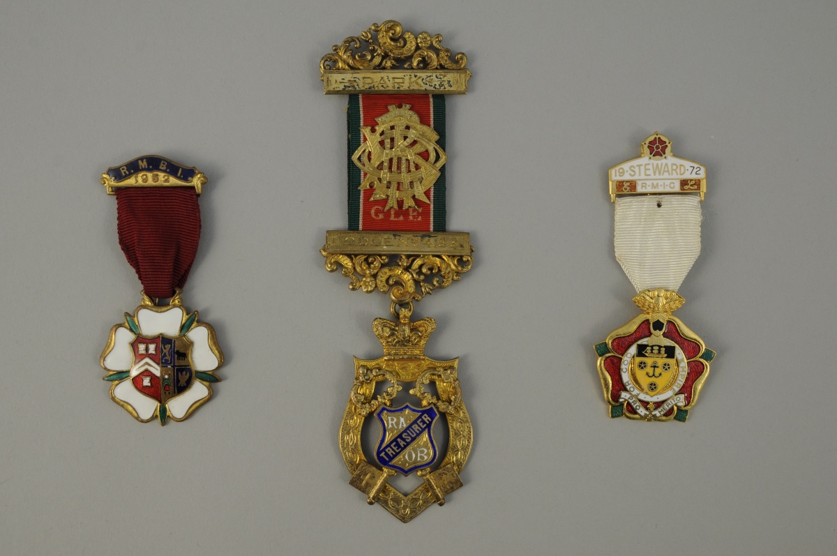 LOT de TROIS MÉDAILLES anglaises. Médaille de trésorier de la loge Parks et deux médailles à la rose, dont une de steward. Argent doré, métal doré et émail. Rubans. XXème. Haut. 15,2 cm, pour la plus grande.