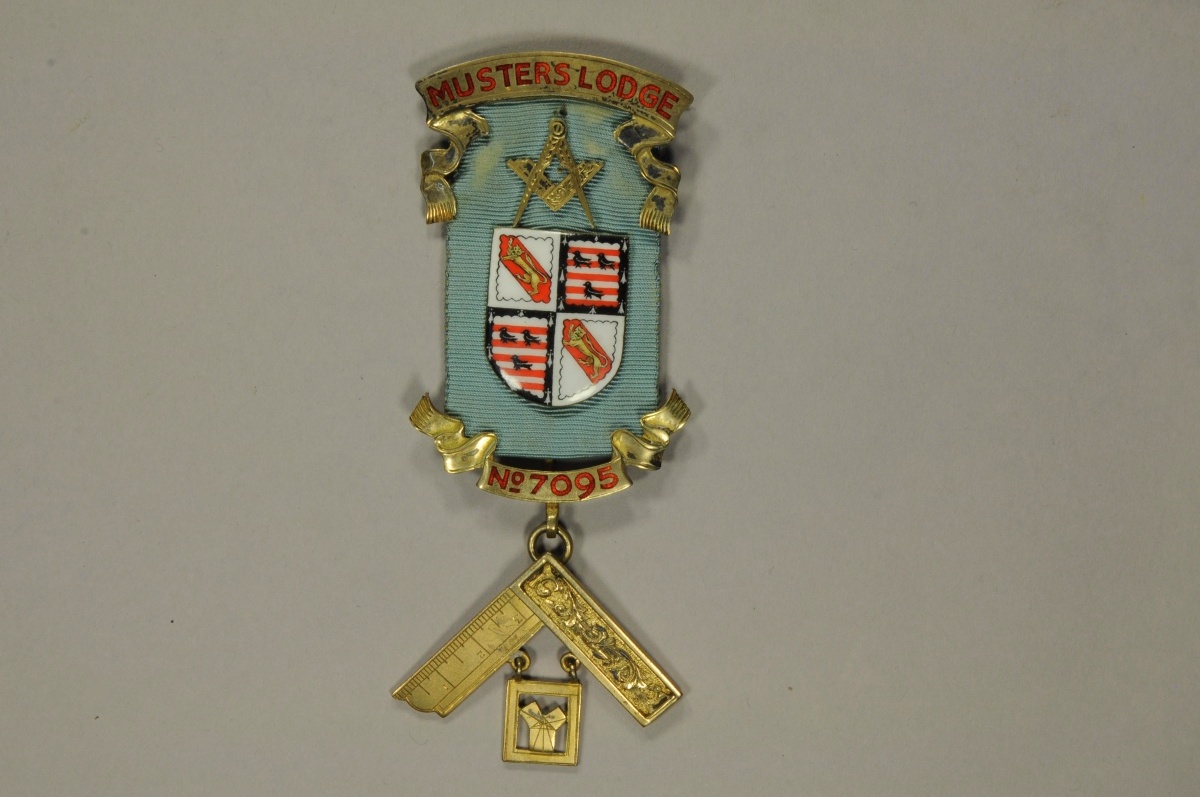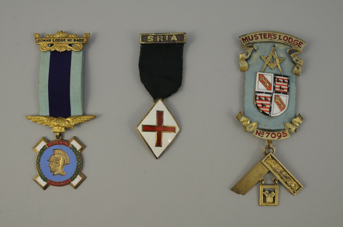 LOT de TROIS MÉDAILLES anglaises. Loge Musters, Roman Wrekin Province et S.R.I.A. Argent doré, métal doré et émail. Rubans. XXème. Haut. 13 cm, pour la plus grande.
