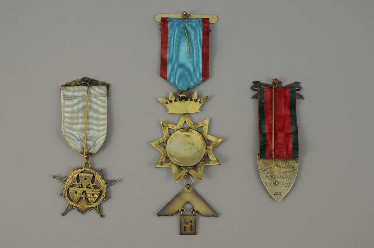 LOT de TROIS MÉDAILLES anglaises. Loges Chillingham, Midsurrey et médaille à l'étoile et à l'équerre couronnées. Argent, cuivre, métal doré et émail. Rubans. XXème. Haut. 17,3 cm, pour la plus grande.