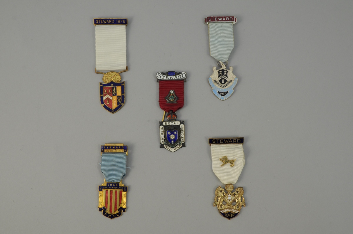 LOT de CINQ MÉDAILLES de steward de la Royal Masonic Benevolant Institution, et deux médailles de la Royal Masonic Institution for Boys et for Girls. Argent, métal doré et émail. Rubans. XXème. Haut. 10,4 cm, pour la plus grande.