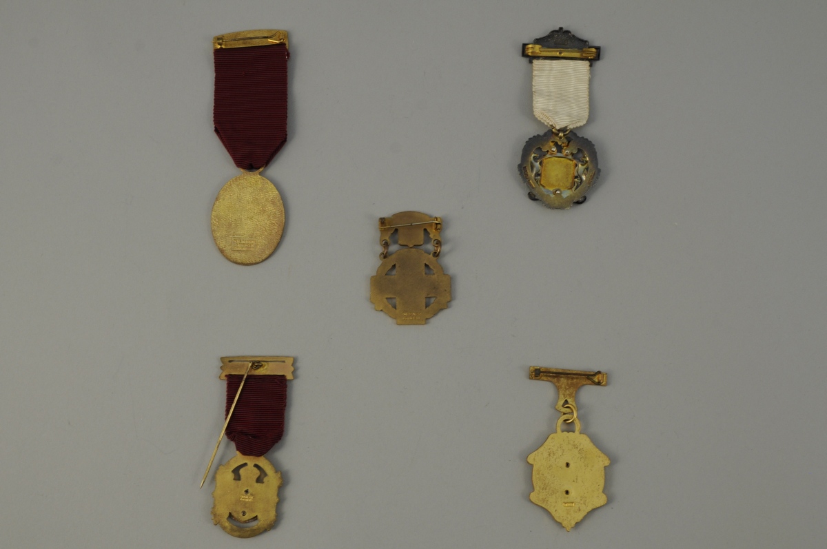 LOT de CINQ MÉDAILLES de steward comprenant deux médailles de la Royal Masonic Benevolant Institution, trois médailles de la Royal Masonic Institution for Boys et for Girls. Argent, métal doré et émail. Rubans. XXème. Haut. 10,8 cm, pour la plus grande.