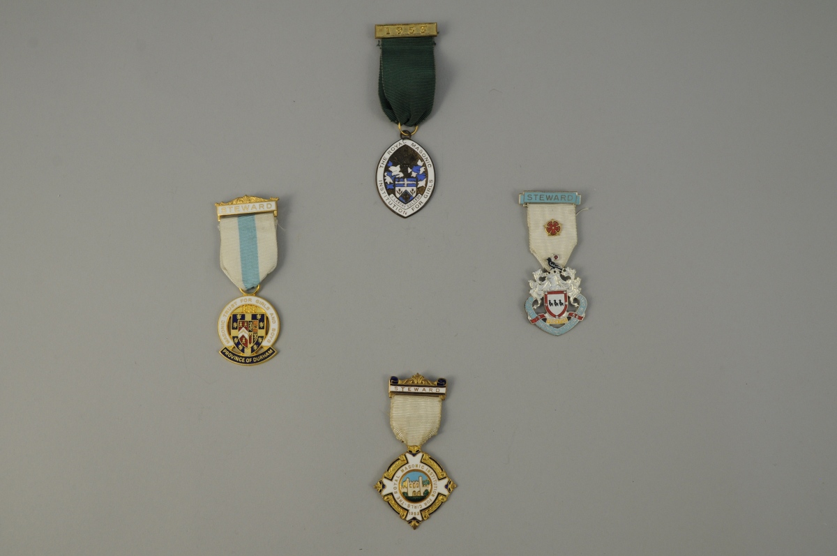 LOT de QUATRE MÉDAILLES de la Royal Masonic Institution for Girls dont trois médailles de steward. Argent, métal doré et émail. Rubans. XXème. Haut. 11,8 cm, pour la plus grande.