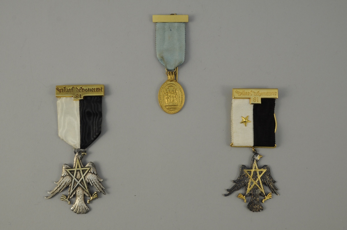 LOT de TROIS MÉDAILLES. Deux médailles Vilard de Honecourt et une médaille Quatuor Coronati. Argent et métal doré. Rubans. XXème. Haut. 11,2 cm.