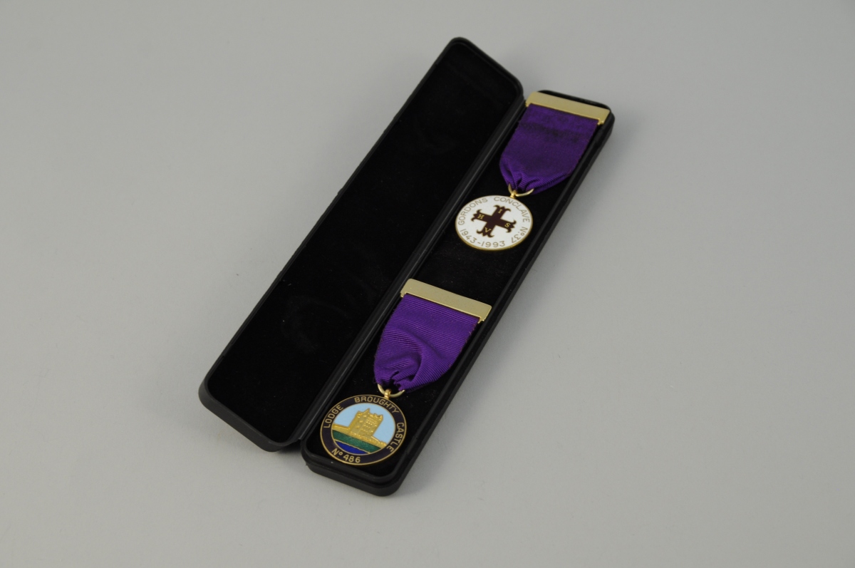 DEUX MÉDAILLES. Conclave de la loge Gordons, datée 1943-1993 et loge Broughty Castle. Métal doré et émail. Rubans bleus. XXème. Haut. 9,5 cm. Dans un écrin de la maison Chapmans.