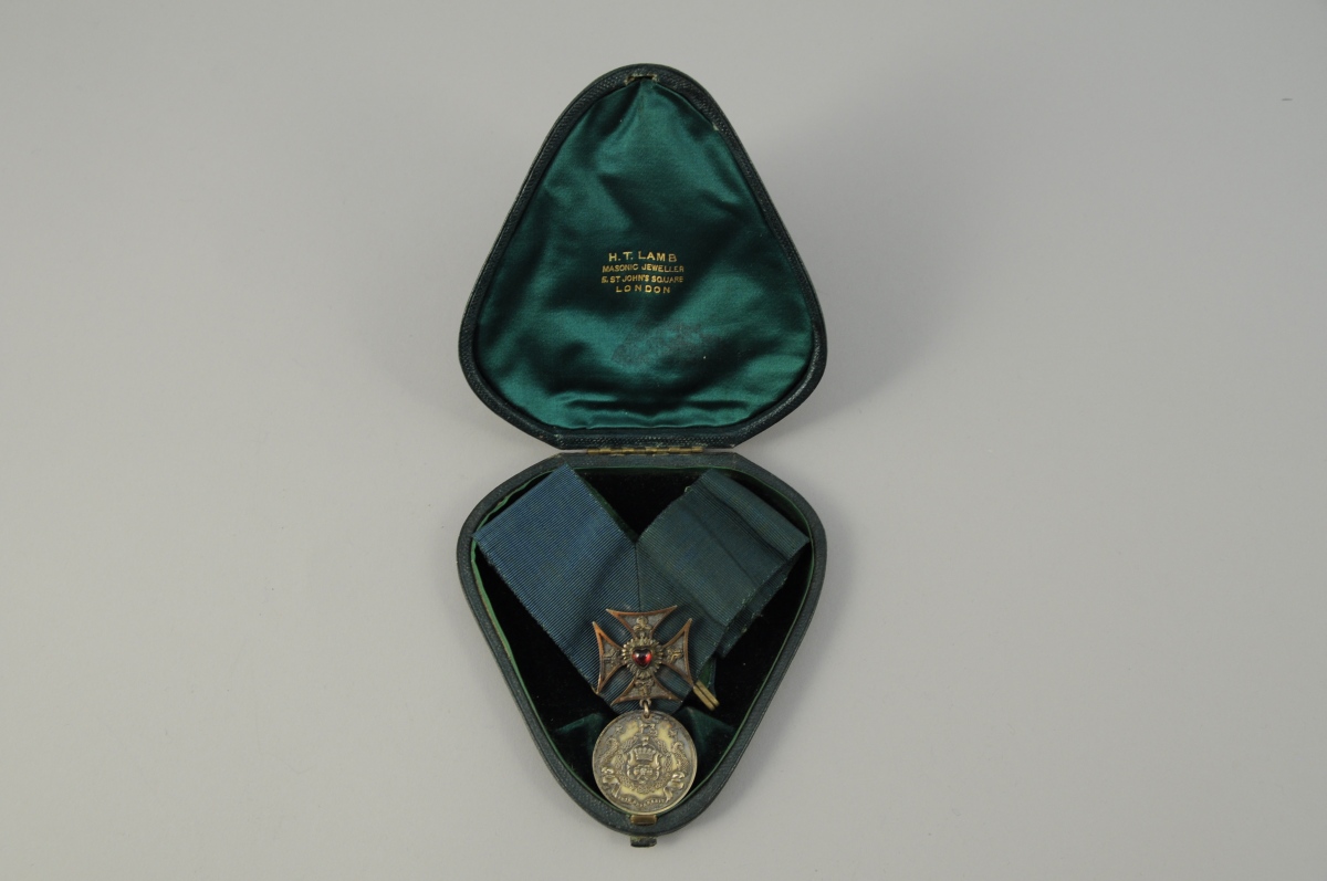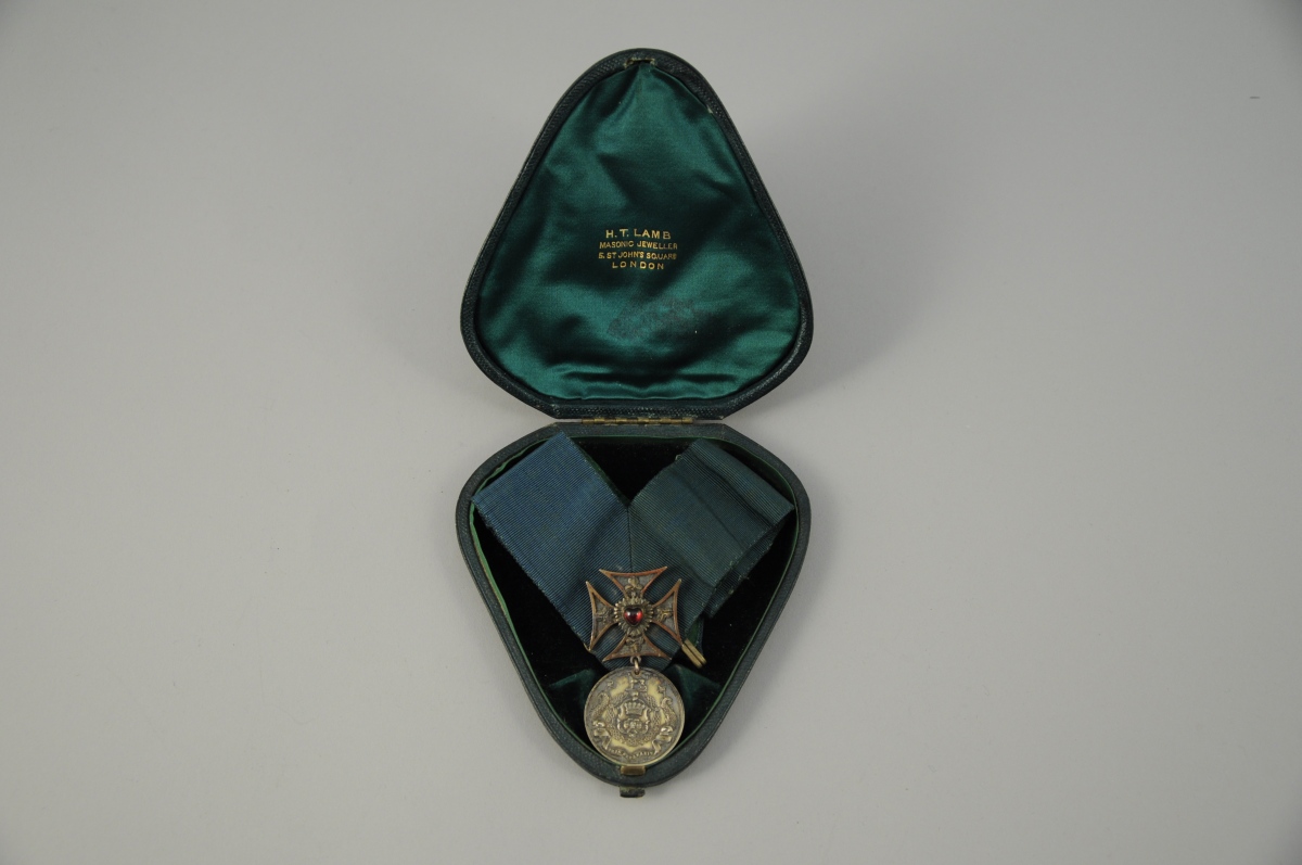 MÉDAILLE en argent doré, en forme de croix patée centrée d'un coeur en pierre de couleur rouge. Médaillon en pendentif marqué de la devise "QUIS SEPARABIT" et "FIDELIS ET CONSTANS". Cordon vert. Fin XIXème-Début XXème. Haut. 6 cm. dans un écrin de la maison H.T Lamb, joailler maçonnique à Londres.