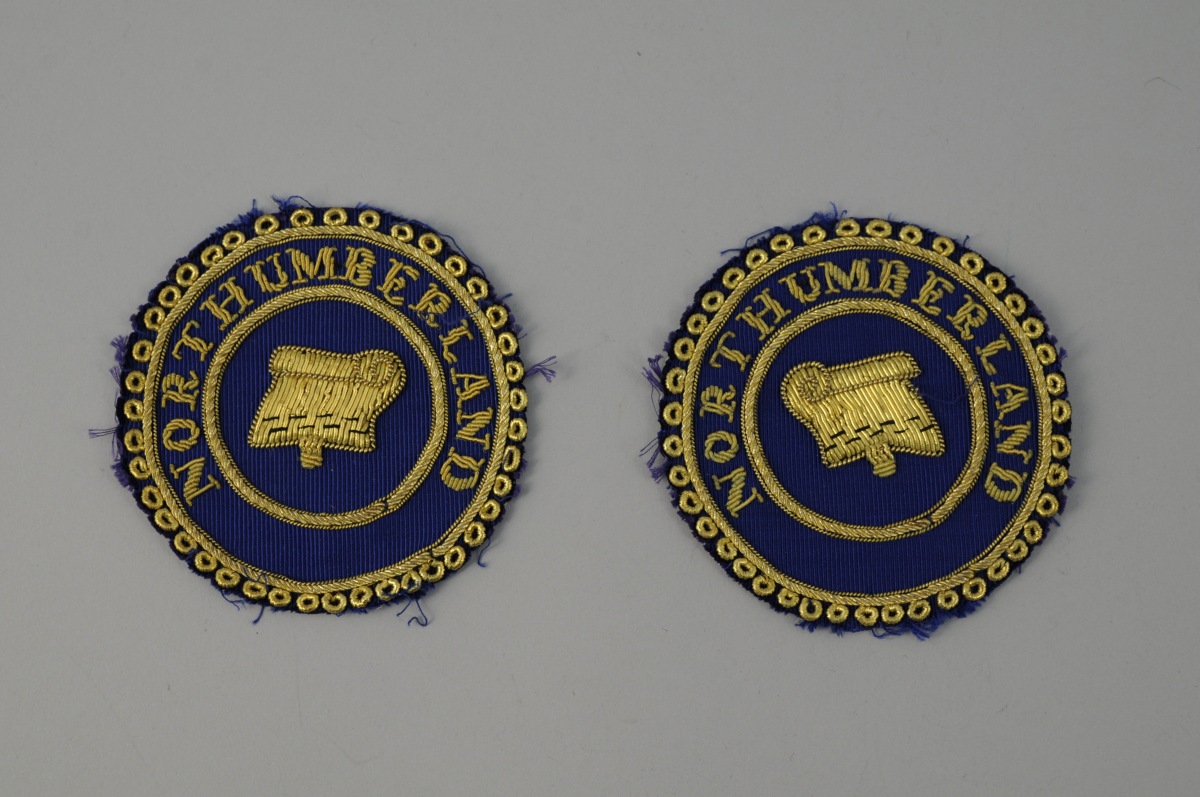 PAIRE d'ÉCUSSONS en tissu cotelé bleu. Décor brodé au fil doré dans un double médaillon d'une main tenant un parchemin. Marqué "NORTHUMBERLAND". XXème. Diam. 9,2 cm.