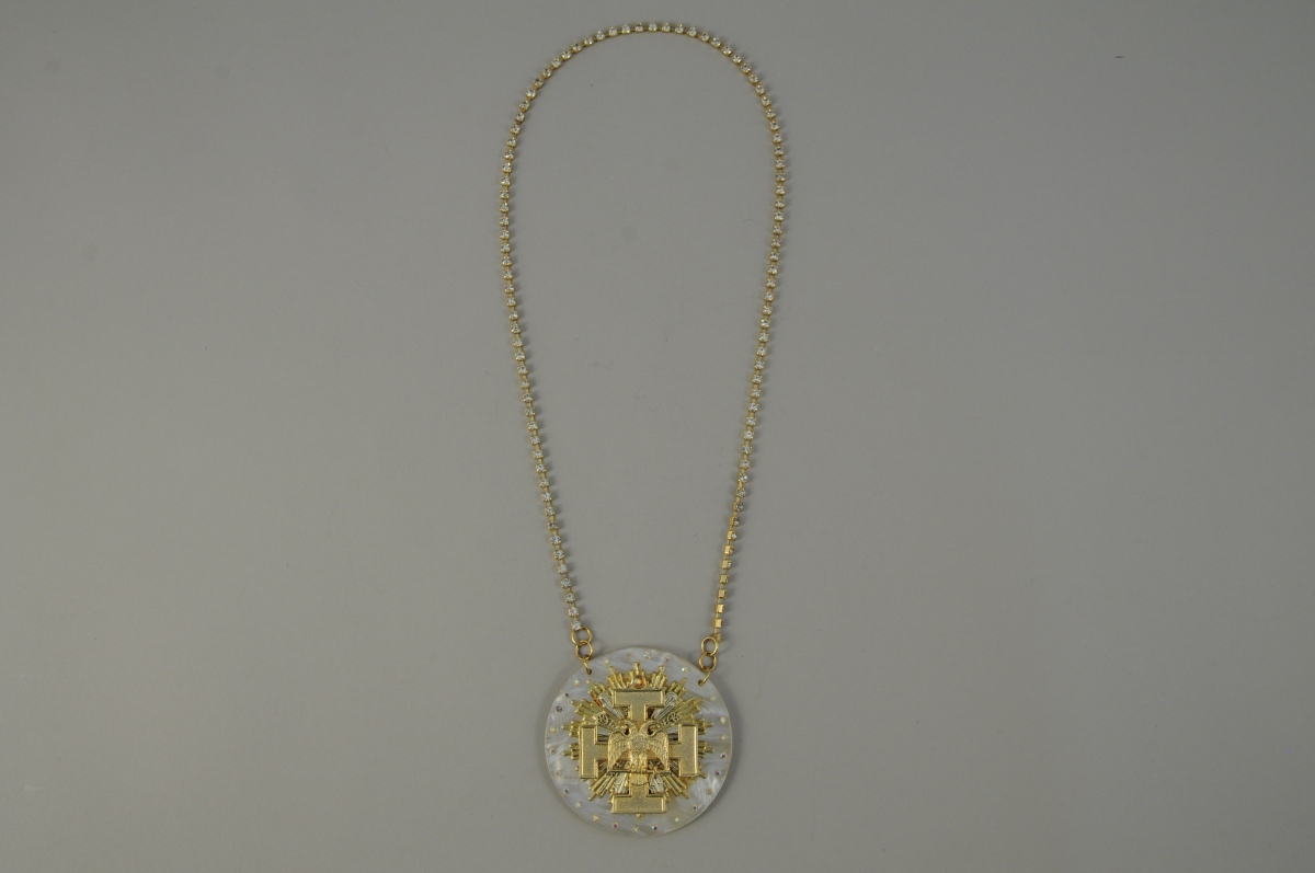 COLLIER en métal doré et imitation nacre. Médaillon à décor appliqué d'une croix à béquilles rayonnante centrée d'un aigle à deux têtes perché sur une épée. Strass et pierres de couleur. Chaine en métal doré et strass. XXème. Diam. 7,9 cm.