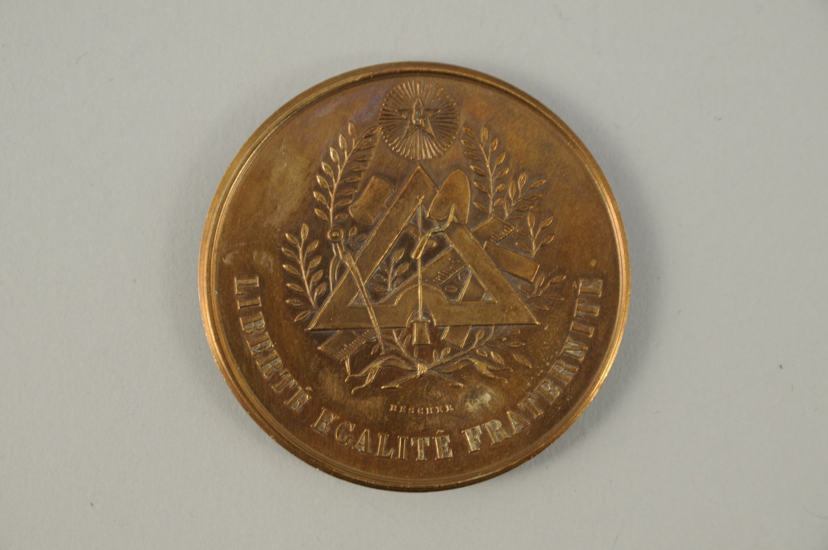 MÉDAILLE en bronze. Décor d'attributs maçonniques sommés d'une étoile rayonnante marquée d'un G, marquée "LIBERTÉ ÉGALITÉ FRATERNITÉ" et "BESCHER" sur le bord. Au revers, les armes de la ville de Périgueux dans une couronne de feuillages. XXème. Diam. 5 cm.