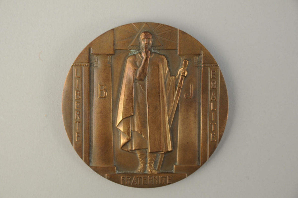 MÉDAILLE en bronze. Décor en relief d'un personnage faisant signe de garder le silence, il se tient entre deux colonnes marquées "B / J" et sa tête repose sur une oyramide rayonnante. Marquée "LIBERTÉ ÉGALITÉ FRATERNITÉ". Au revers, le compas et l'équerre centrés d'une poignée de main. Marquée "G.O.D.F / FRATERNITÉ DES PEUPLES / F. LÉVÊQUE / 1906-1952". XXème. Diam. 5,9 cm.