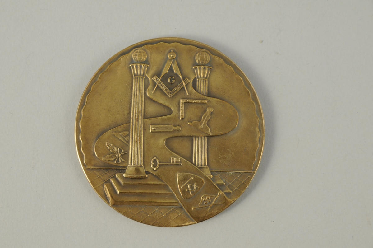 MÉDAILLE en bronze. Décor du pavé mosaïque, de deux colonnes sommées de globes et d'attributs maçonniques . Au revers, compas et équerre centrés d'une étoile, d'un croissant et d'une croix. Marquée "GRAND LODGE OF THE STATE OF ISRAEL", caractères et hébraïques et datée "1953-1978". Diam. 5,9 cm.