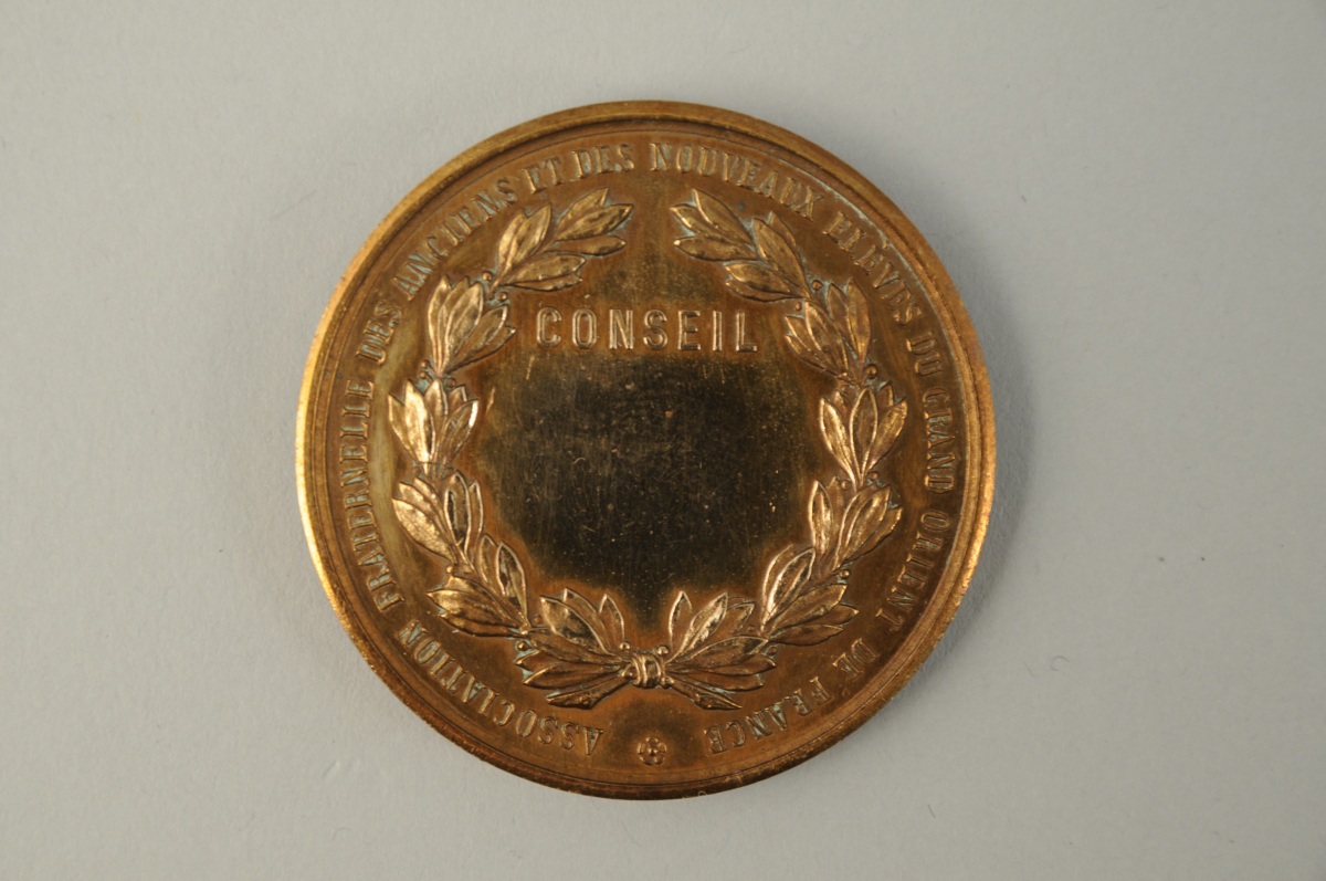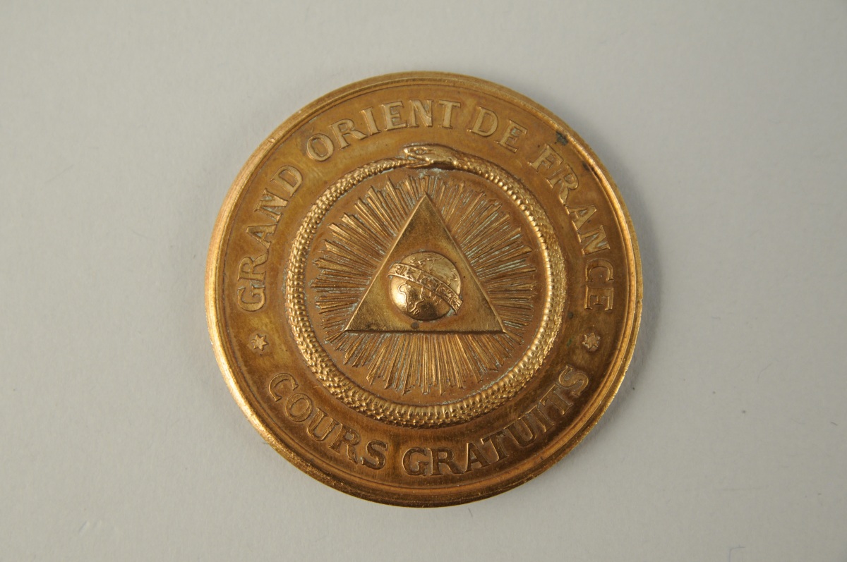 MÉDAILLE en bronze des cours gratuits du Grand Orient de France. Décor d'une pyramide rayonnante centrée d'un globe et d'un serpent se mordant la queue. Au revers, une couronne de laurier centrée de la mention "CONSEIL". Marquée sur le bord "Association fraternelle des anciens et des nouveaux élèves du Grand Orient de France". XXème. Diam. 4,1 cm.