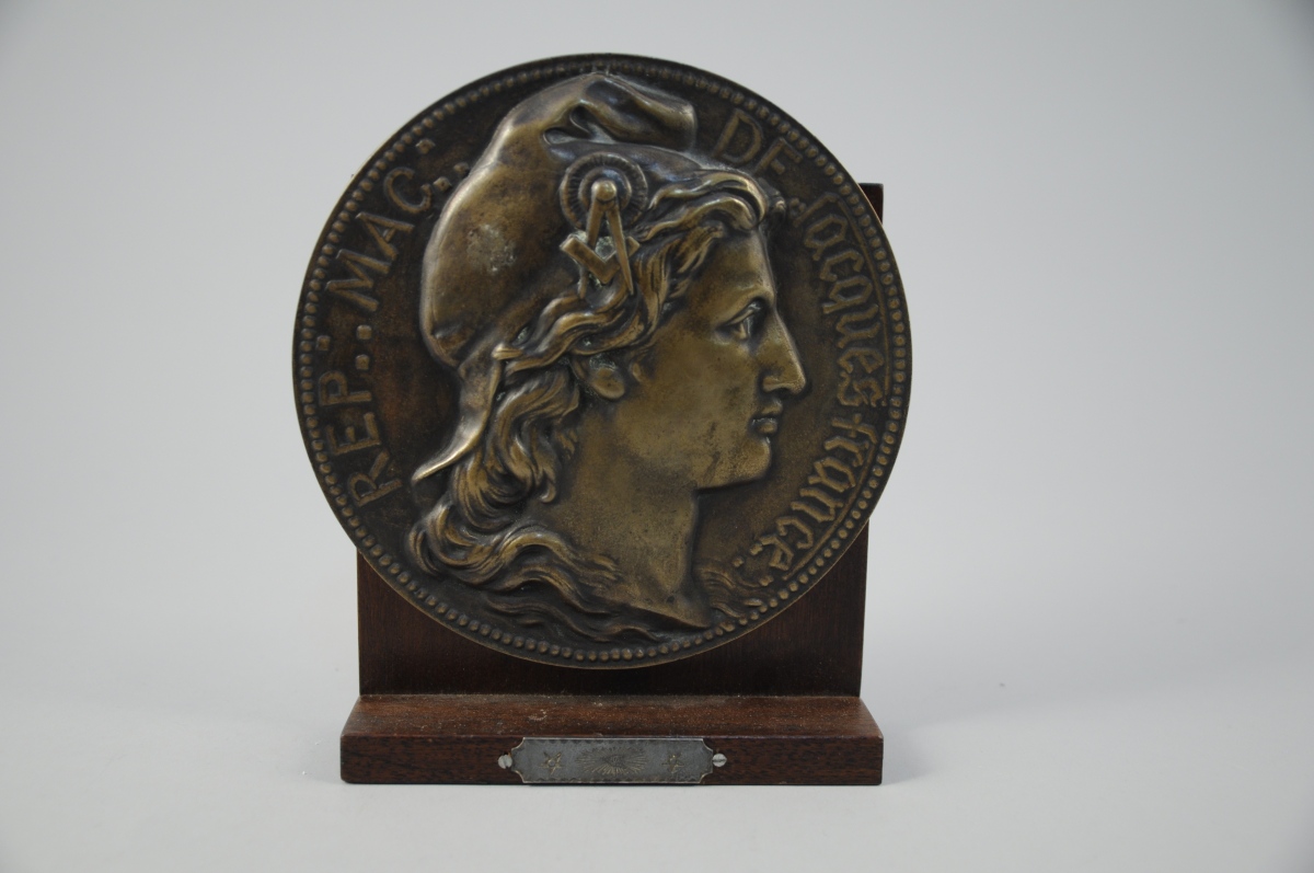 GRANDE MÉDAILLE en bronze à patine brune représentant la Marianne de Jacques FRANCE de profil. Elle porte un bonnet phrygien dont la cocarde est ornée du compas et de l'équerre. Marquée "REP. MAC de Jacques France". XXème. Diam. 17,4 cm. Fixée sur un socle en bois.