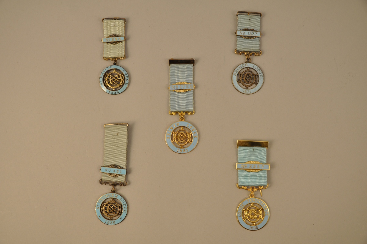 LOT de CINQ MÉDAILLES anglaises provenant des loges Saint-David, Saint-George, Anchor, Selwyn et Temperance . Argent, métal doré et émail bleu. Rubans. XXème. Haut. 11,3 cm, pour la plus grande.
