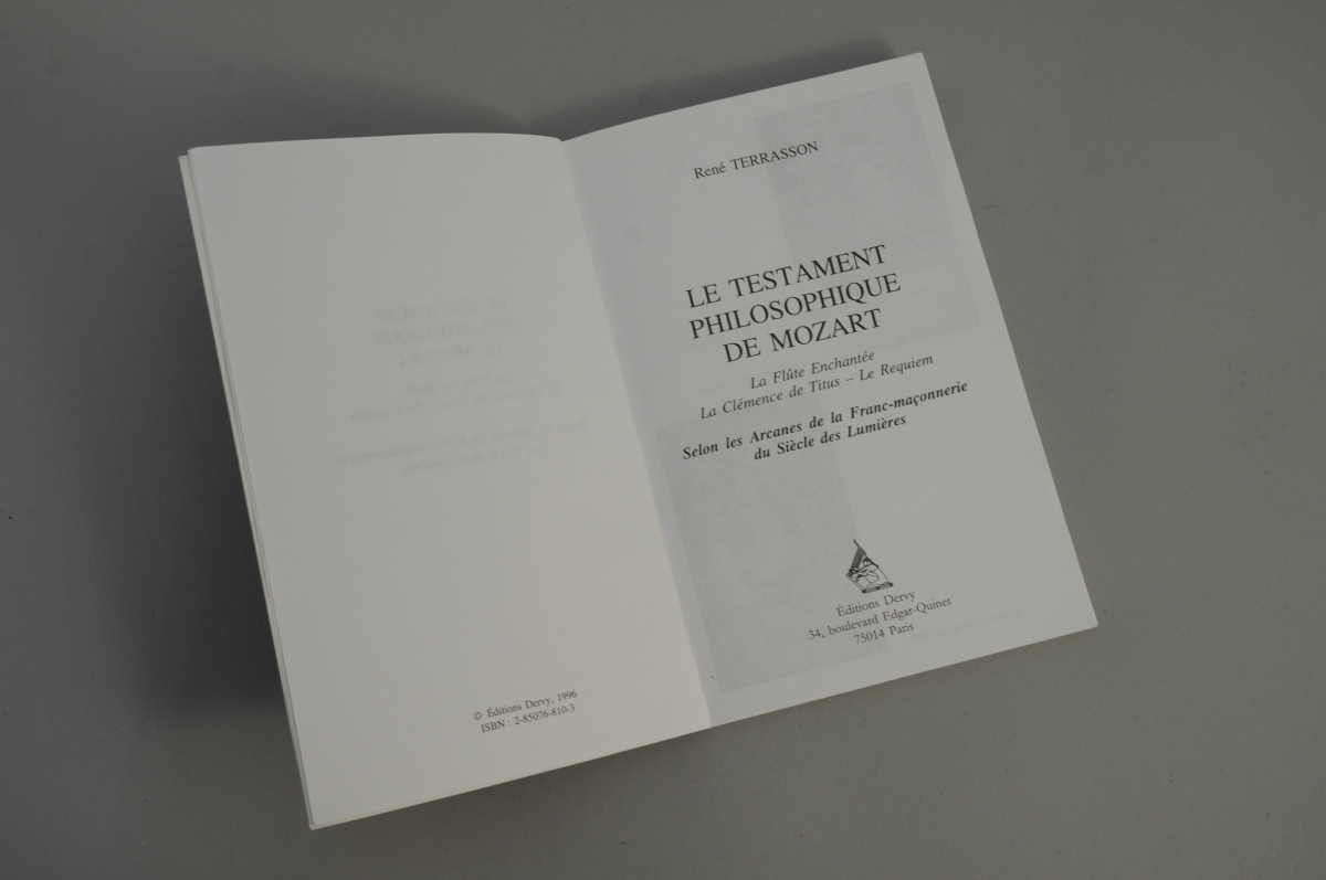 TERRASSON, RENÉ. Le testament philosophique de Mozart. Paris, Dervy, 1996. In-8, broché.