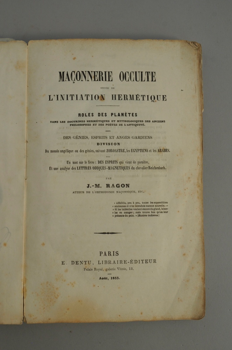 RAGON, JEAN-MARIE. Maçonnerie occulte, suivie de L'Initiation hermétique. Paris, Dentu, 1853. In-8, broché. (défraîchi)