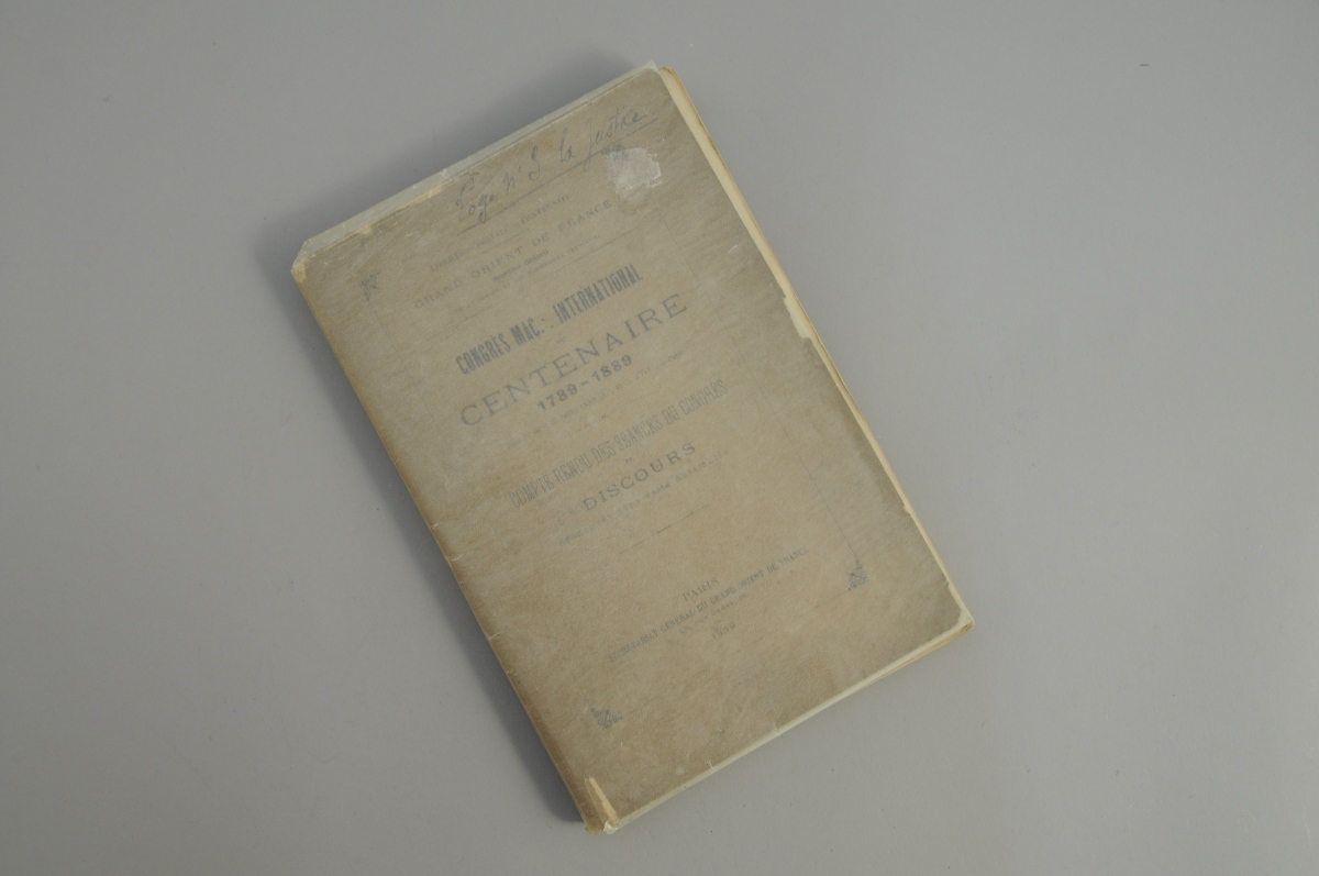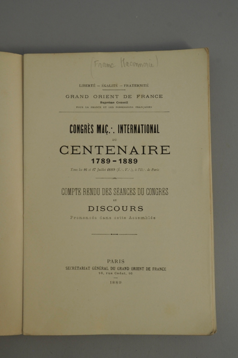 CONGRÈS MAÇONNIQUE INTERNATIONAL, Grand Orient de France, centenaire (1789-1889), compte rendu des séances du congrès et discours prononcé dans cette assemblée. Paris, Secrétariat général du Grand Orient de France, 1889. In-8, Broché.