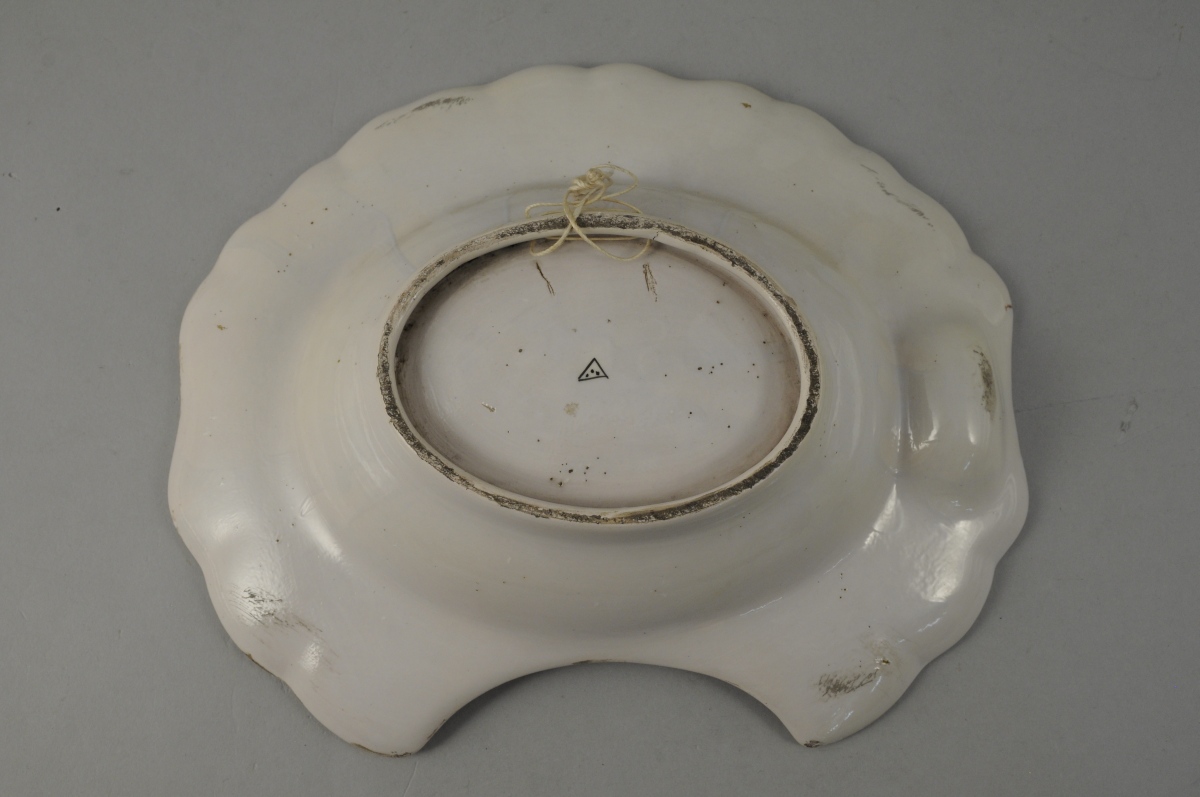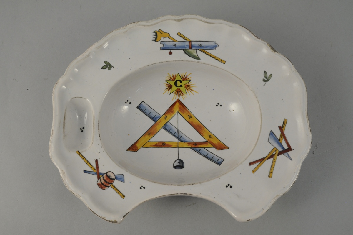 CENTRE de la FRANCE. PLAT à BARBE en faïence à bord contourné. Décor polychrome de la règle, du perpendiculaire et d'une étoile centrée d'un "G" sur le bassin. Trophées maçonniques, de feuillages et mouchetures d'hermine sur l'aile. Fin XIXème. Long. 28,6 cm.