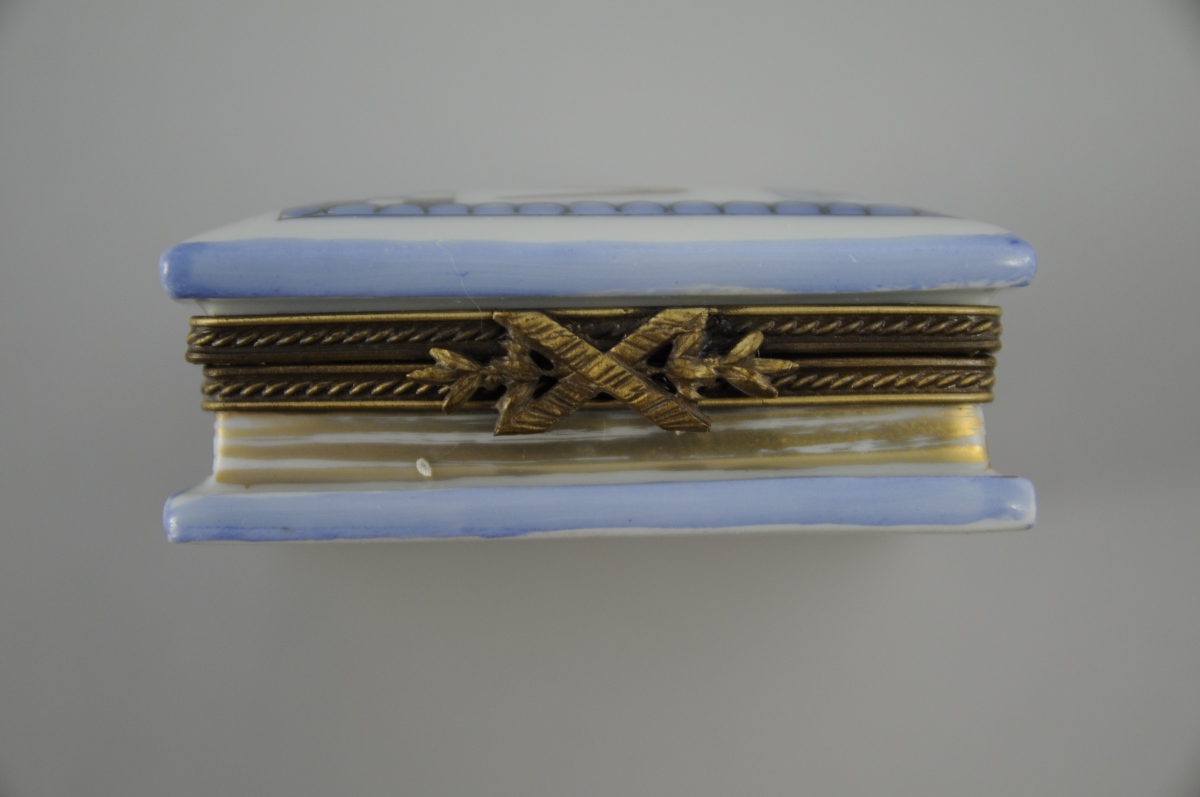 LIMOGES. PETITE BOITE rectangulaire en porcelaine. Décor polychrome d'attributs maçonniques. Filet bleu sur le bord. A l'intérieur, une étoile et une branche feuillagée. XXème. Haut. 2,2, Larg. 5,8, Prof. 4,7 cm.