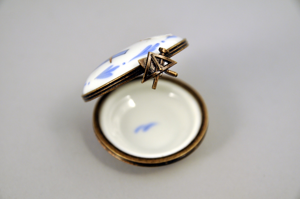 LIMOGES. PETITE BOITE circulaire en porcelaine. Décor polychrome d'attributs maçonniques. Rinceaux bleus sur le bord, au revers et en rappel à l'intérieur. Marquée au revers "Limoges France / Peint main / L.N". XXème. Diam. 4,6 cm.