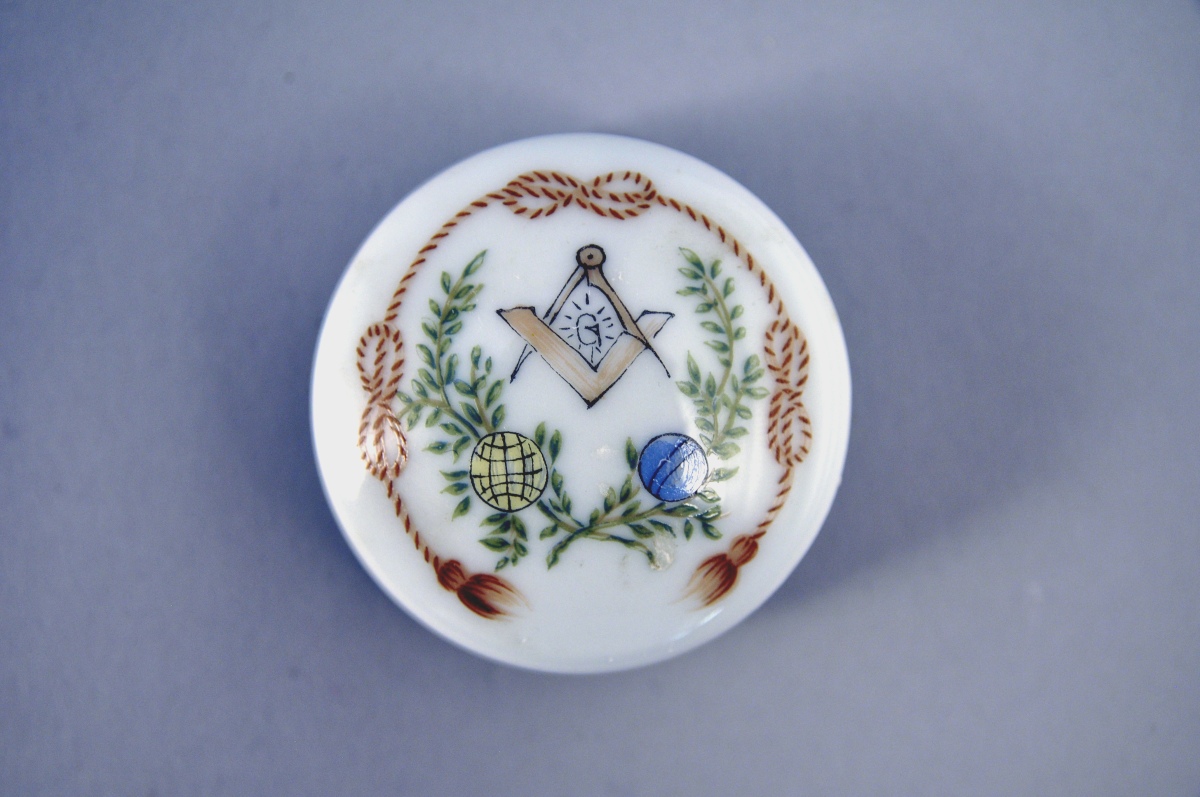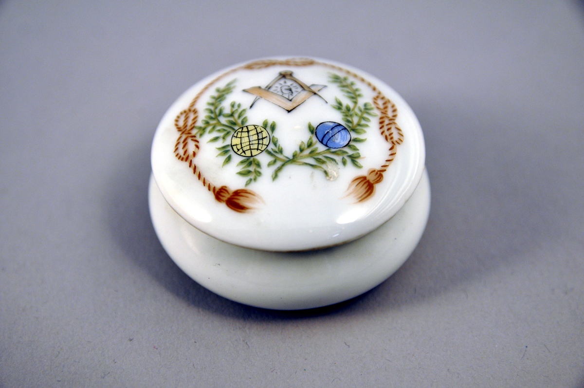 PETITE BOITE circulaire en porcelaine. Décor polychrome d'attributs maçonniques. Marquée "G.L.N.F VAL DE LOIRE 25 juin 5988" au revers. Fin XXème. Diam. 5 cm.