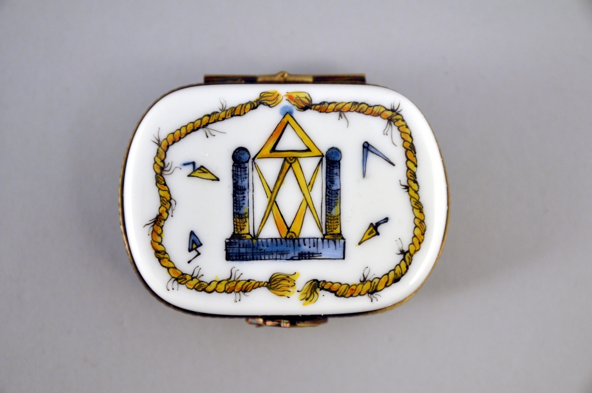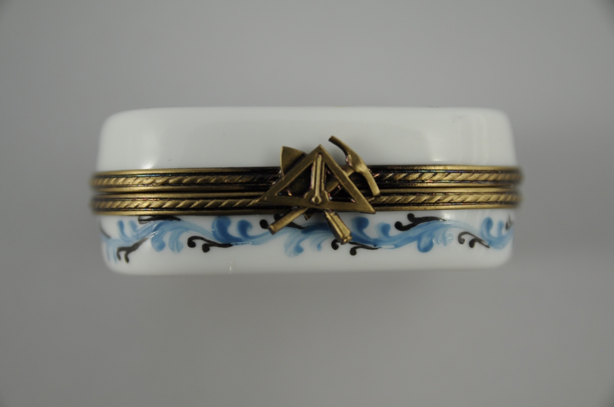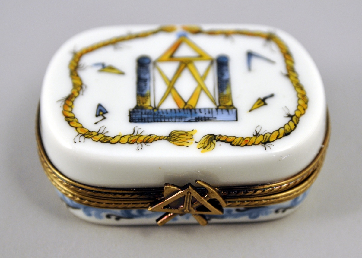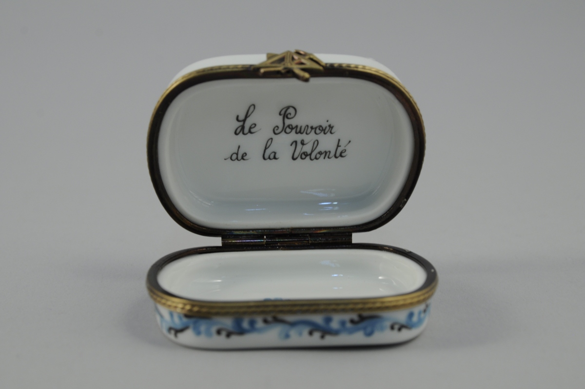 LIMOGES. PETITE BOITE rectangulaire à bords arrondis en porcelaine. Décor polychrome d'attributs maçonniques. Rinceaux bleus sur le bord et en rappel à l'intérieur. Inscription "Le Pouvoir de la Volonté" à l'intérieur. Marquée au revers "Peint main / Limoges France / A.S". XXème. Long. 5,6, Larg. 4,5 cm.