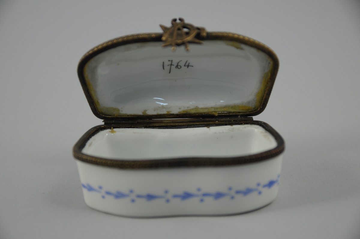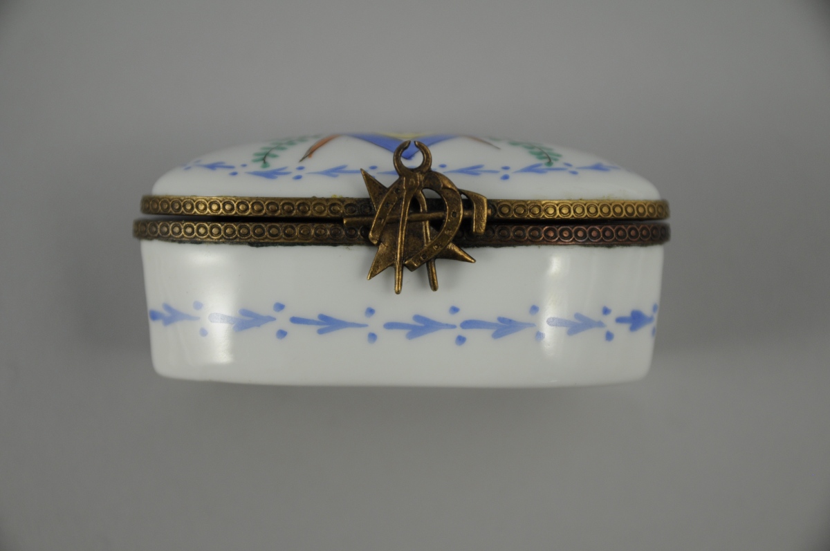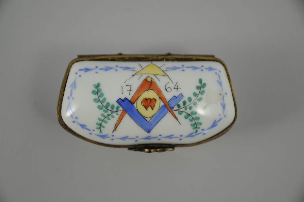 LIMOGES. PETITE BOITE de forme chantournée en porcelaine. Décor polychrome d'attributs maçonniques. Datée 1764 sur le couvercle et à l'intérieur. Rinceaux bleus sur le bord. Marquée au revers "C.M". XXème. Diam. 4,6 cm.