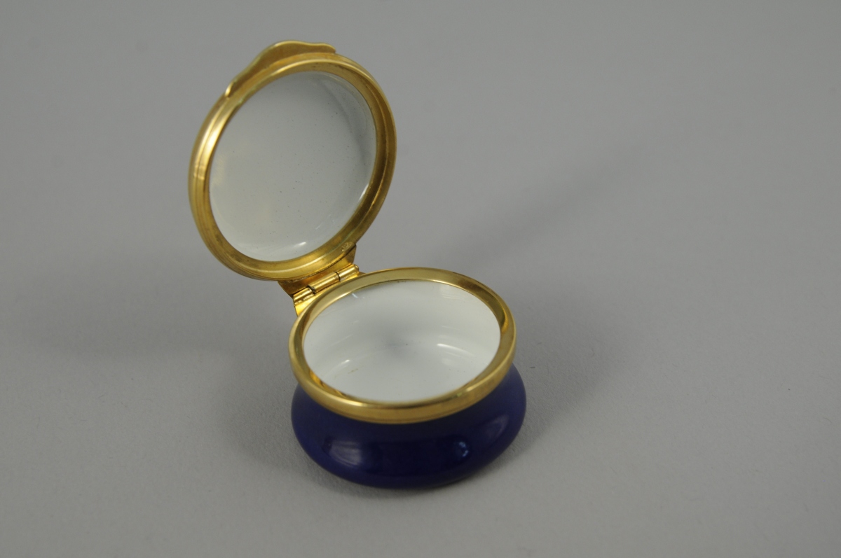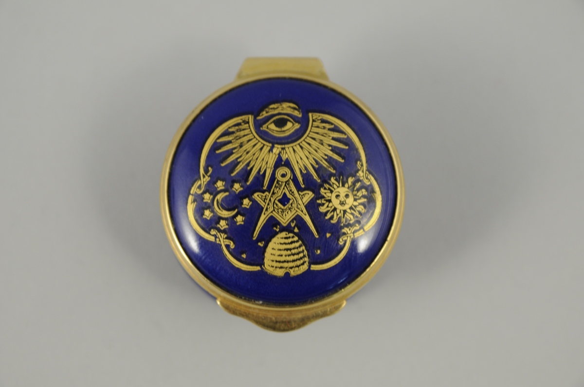 ANGLETERRE. PETITE BOITE en émail de Birmingham bleu et blanc. Décor or d'attributs maçonniques. Marque "TKS"au revers pour Toye, Kenning and Spencer LTD, LONDRES . Monture en laiton. Dans un écrin en cuir bordeaux. XXème. Diam. 3,4 cm.