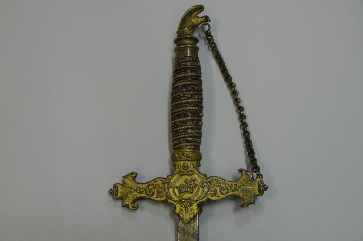 ÉPÉE de CHEVALIER. Poignée en cuir et garde cruxiforme à chainette à deux quillons en bronze ciselé orné de rinceaux et fleurons et surmontée d'un aigle en ronde-bosse. Noeud de corps à décor d'une croix et d'une couronne dans un cartouche et des lettres "K.G.E" dans un écu surmonté d'un aigle. Lame droite à arête centrale gravée d'un philactère portant l'inscription "HORSTMANN / BROS & co / PHIL PA", d'un chevalier couronné par un ange, d'un chevalier à l'étendard, de l'inscription "KNIGHTS GOLDEN EAGLE" et "HERRY IF SNOOK", d'un écu marqué "K.G.E / F.H.L" et de rinceaux. Fourreau en laiton et bronze ciselé à trois anneaux d'attache. Décor d'une crois et d'une couronne, d'un chevalier, de rinceaux et de pierres de couleurs. XXème. Long. de la lame : 68 cm.