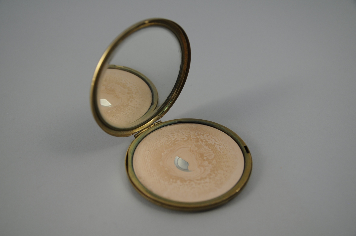POUDRIER circulaire en métal doré et laqué bleu centré d'un médaillon à décor gravé du compas, de l'équerre et d'un "G". Marqué au revers "Stratton / Made in England". XXème. Diam. 7,6 cm.