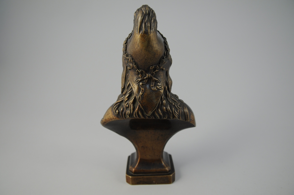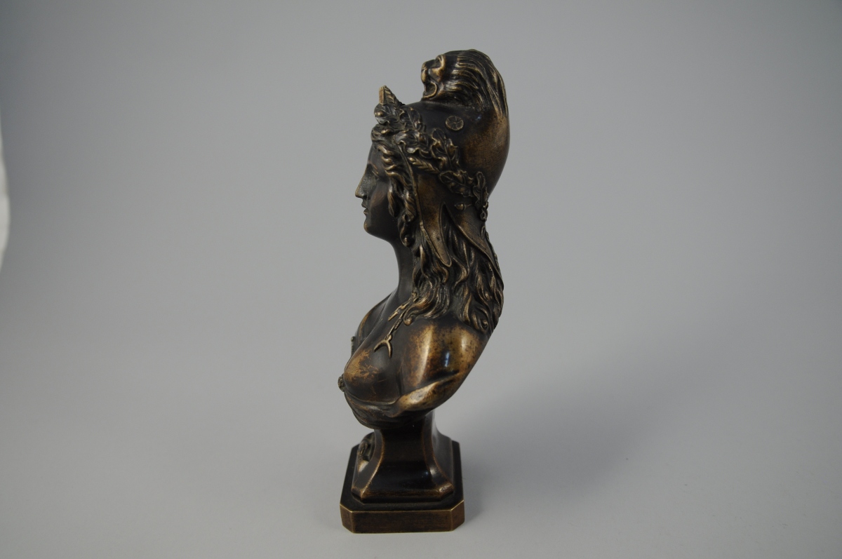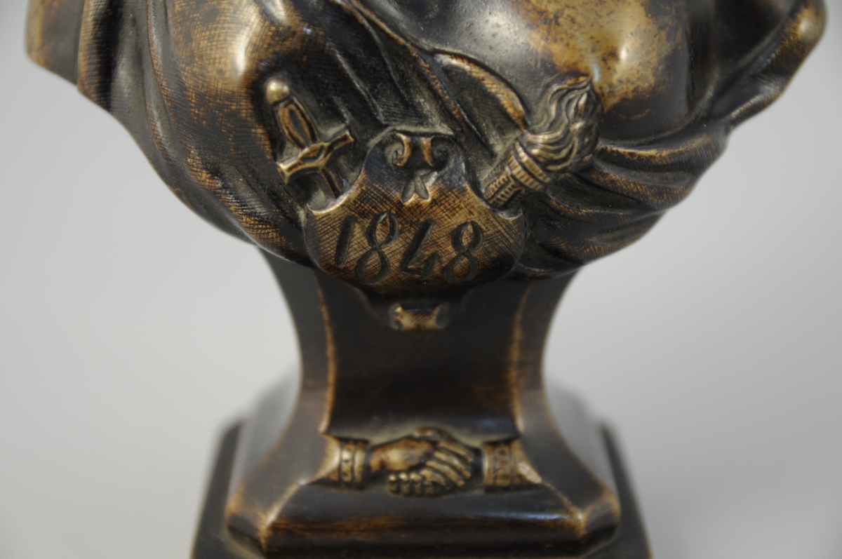 MARIANNE en bronze à patine brune. Elle est coiffée d'un casque à cimier en forme de lion, d'un perpendiculaire et d'une couronne en feuilles de chêne. Sur sa poitrine, un flambeau, une épée et un cartouche portant la date "1848". Poignée de main sur la base. Socle cubique en marbre gris et rose. Haut. 20,3 cm (sans socle), Haut. 28,2 cm (avec socle).