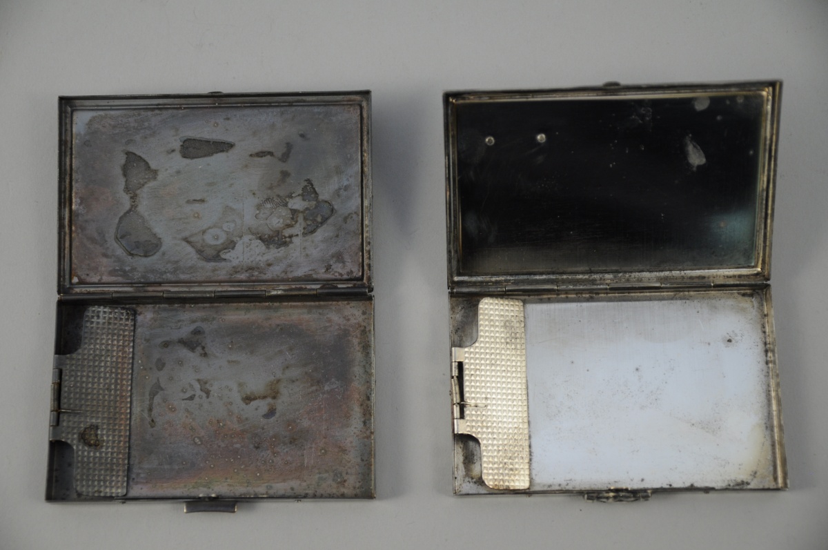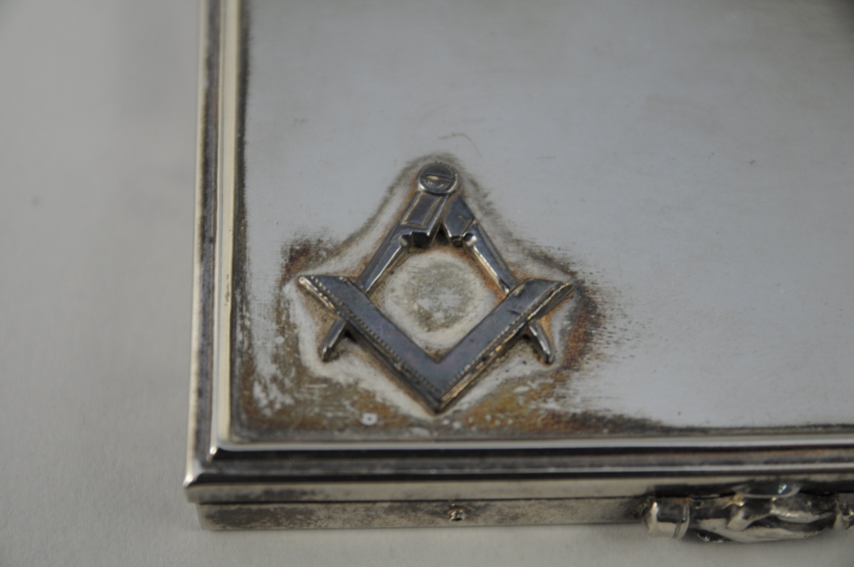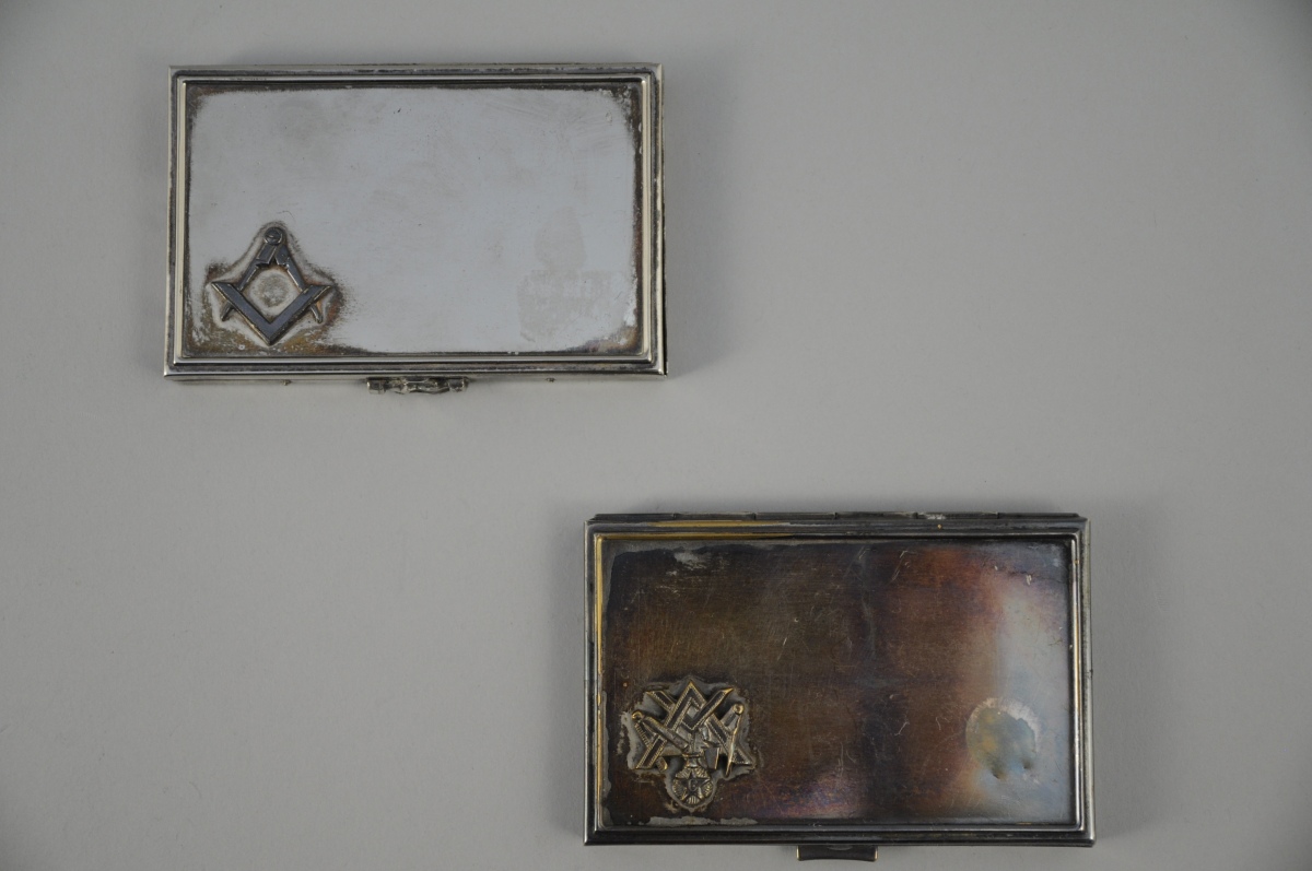 LOT de deux ÉTUIS à CIGARETTES en étain rectangulaires. Décor ciselé d'attributs maçonniques. Couvercle s'ouvrant à charnière. XXème. Long. 9,5, Larg. 6,2 cm (pour les deux).