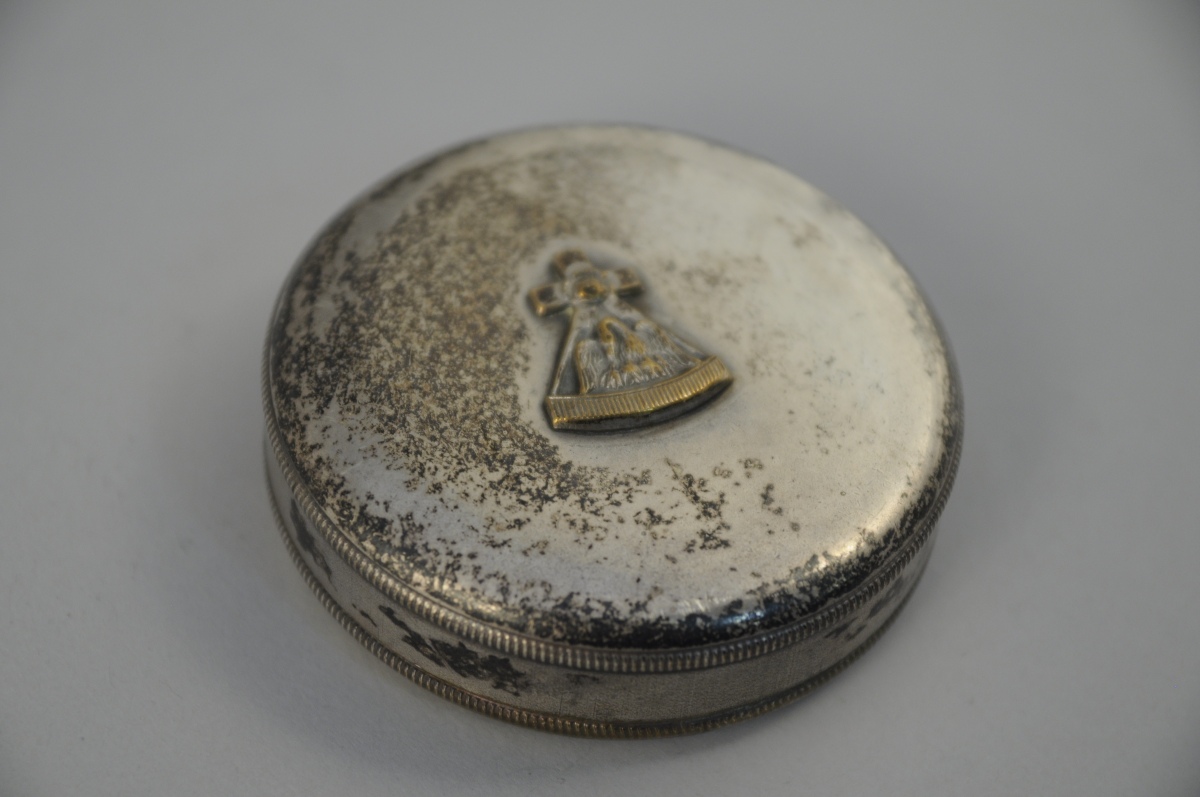 BOITE ronde en étain. Décor appliqué d'attributs maçoniques. XXème. Diam. 6,5 cm.