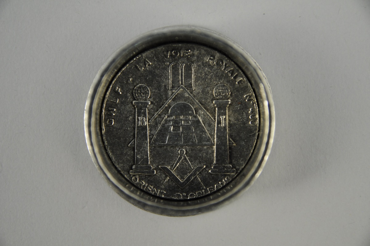 PAIRE de BOITES ronde en étain. Décor appliqué d'une rose sur le couvercle et, à l'intérieur, d'attributs maçoniques et de l'inscription "G.N.L.F - LA VOIE ROYALE N°400 / ORIENT D'ORLÉANS". Poinçon au revers VTRM couronné "ÉTAIN 95 %". XXème. Diam. 6,5 cm.