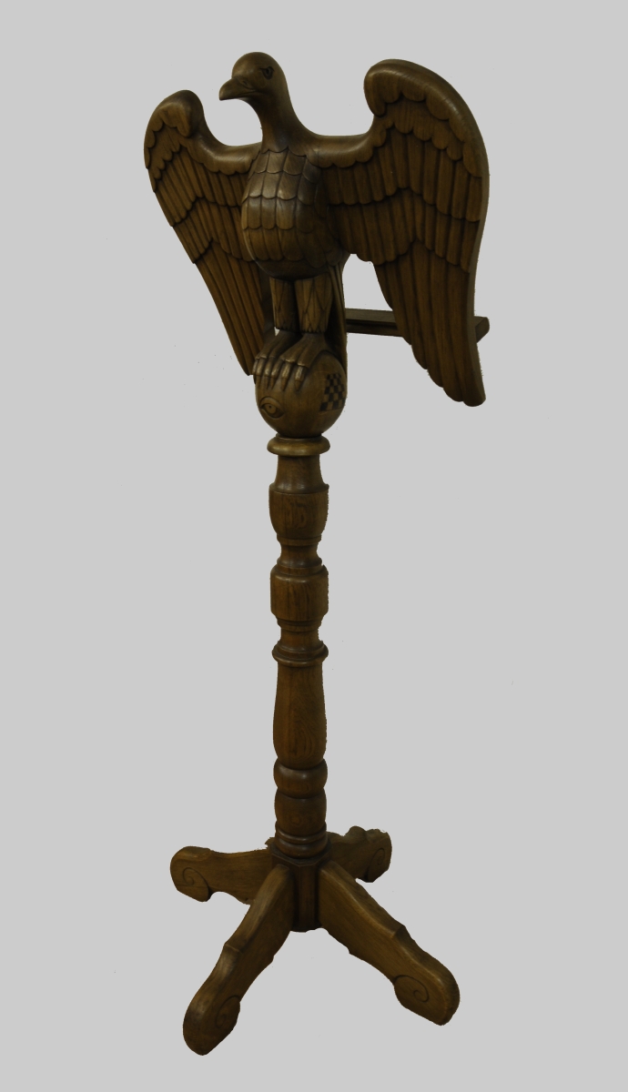 LUTRIN en bois fruitier teinté et sculpté d'un aigle aux ailes déployés en ronde-bosse. Pied tourné en balustre orné du compas et de l'équerre, de l'Oeil de la Providence et du pavé mosaïque. Terminé par quatre pieds en volute. XXème. Haut. 166 cm.