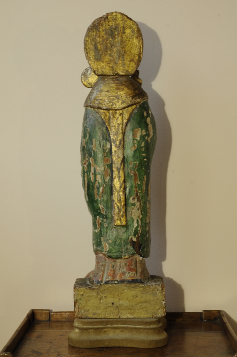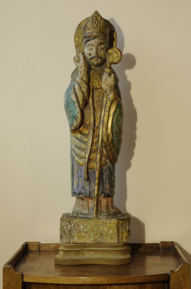 Statue de SAINT ÉVÊQUE en bois sculpté à décor polychrome, la mitre ornée d'un serpent.