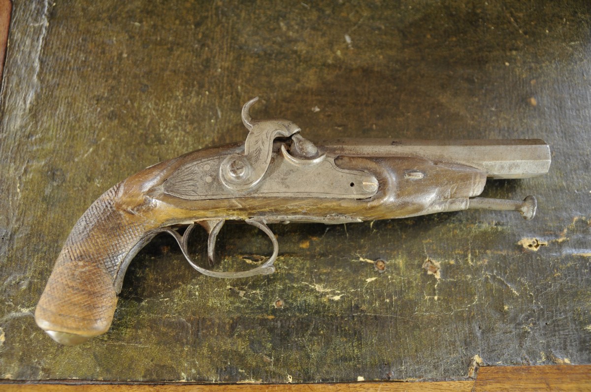 Petit PISTOLET DE POCHE, percussion à capsule, canon octogonal (banc d'épreuve de Liège : E. L. G.), la crosse guillochée. Longueur 25 cm (usure).