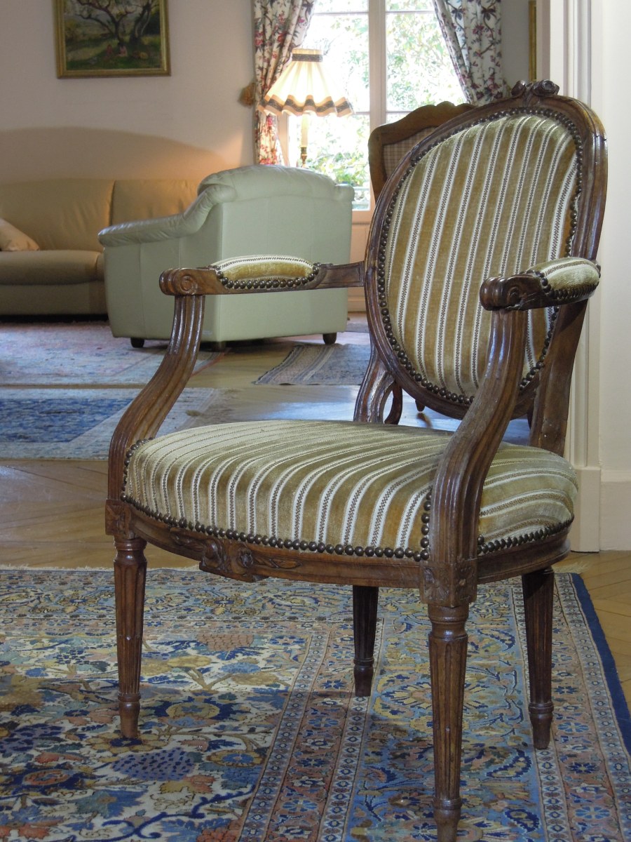 Suite de quatre FAUTEUILS CABRIOLETS en bois sculpté de fleurs et de roses, dossiers médaillons, accotoirs et pieds antérieurs cannelées et rudentés.
