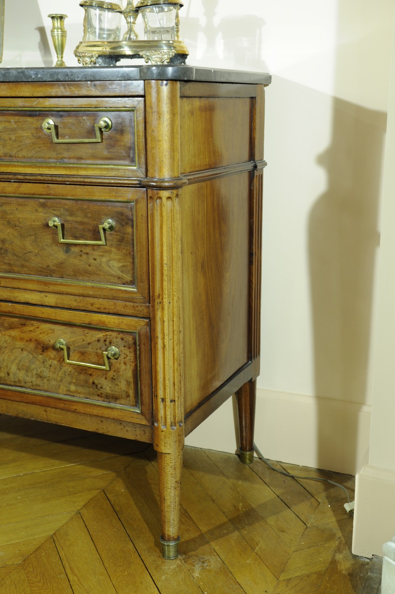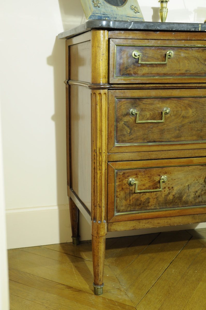 COMMODE en acajou et placage ouvrant à trois tiroirs, les montants antérieurs cannelés, reposant sur quatre pieds fuselés. Entrées de serrures, poignées de tirages et bagues de pied en bronze et laiton. Dessus de marbre gris Sainte-Anne.