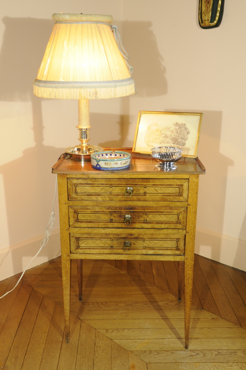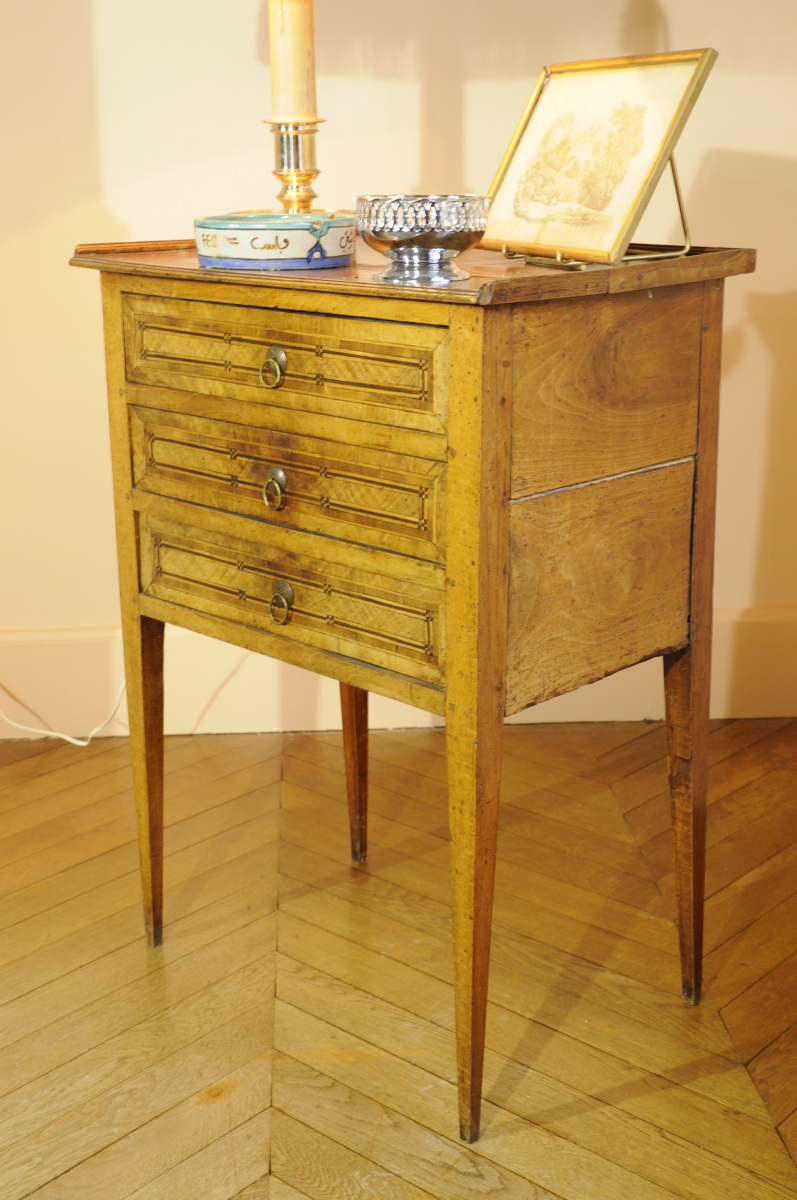 Petite COMMODE en placage de bois fruitier ouvrant à trois tiroirs marquetés d'une frise géométrique, reposant sur quatre pieds carrés fuselés. Travail de l'Est de la France.