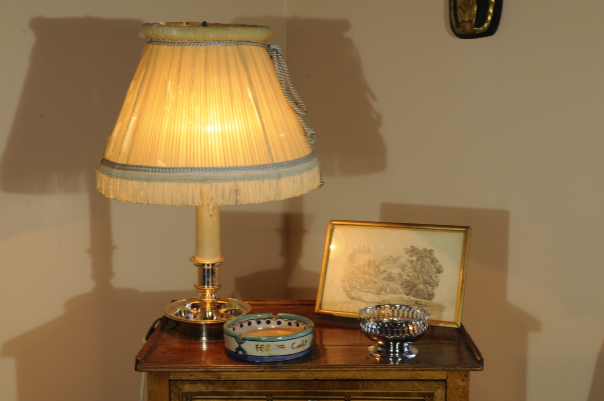 LAMPE D'APPOINT en métal doré figurant un bougeoir chapoté d'un abat-jour, électrifié, deux lumières.