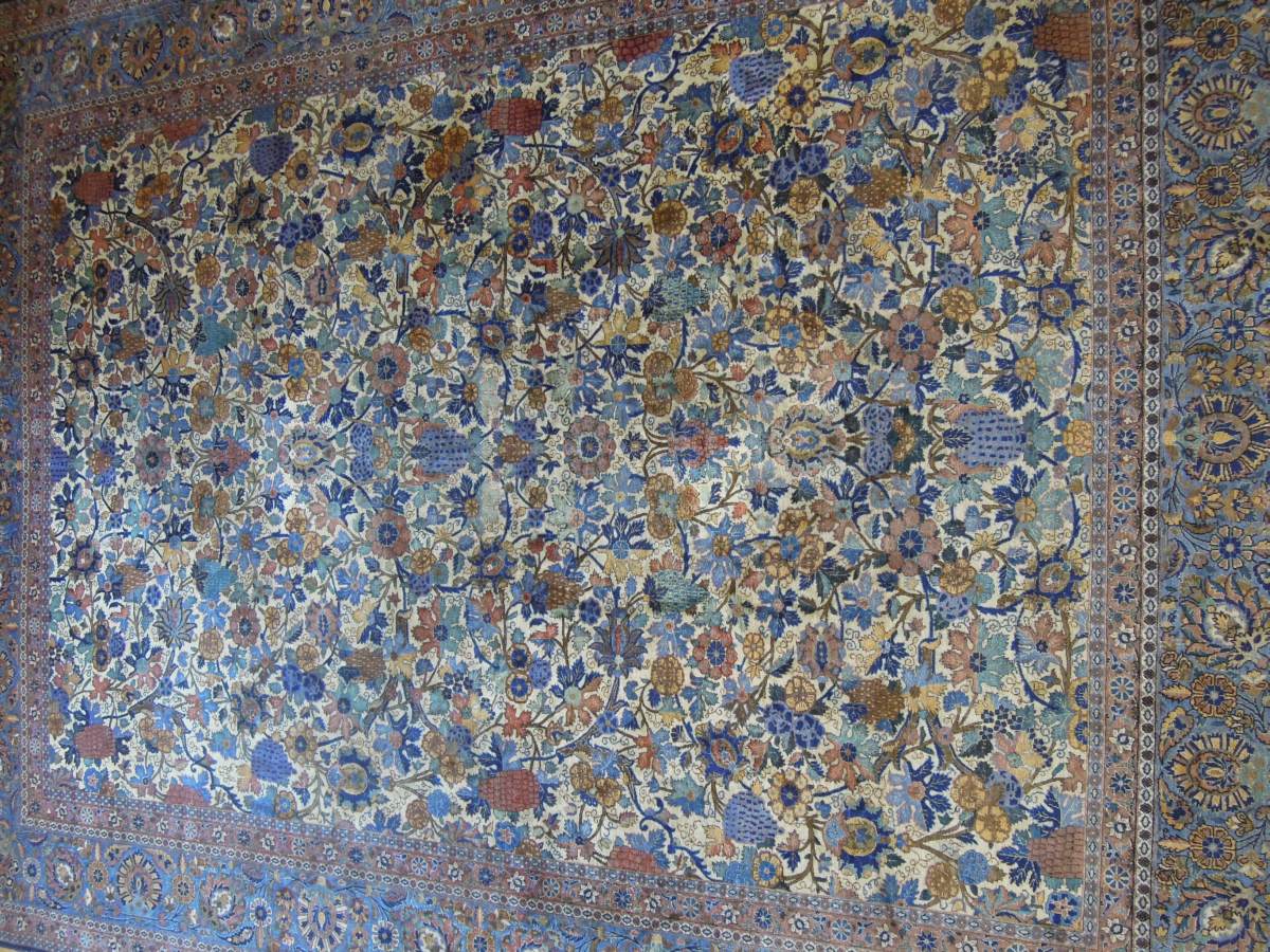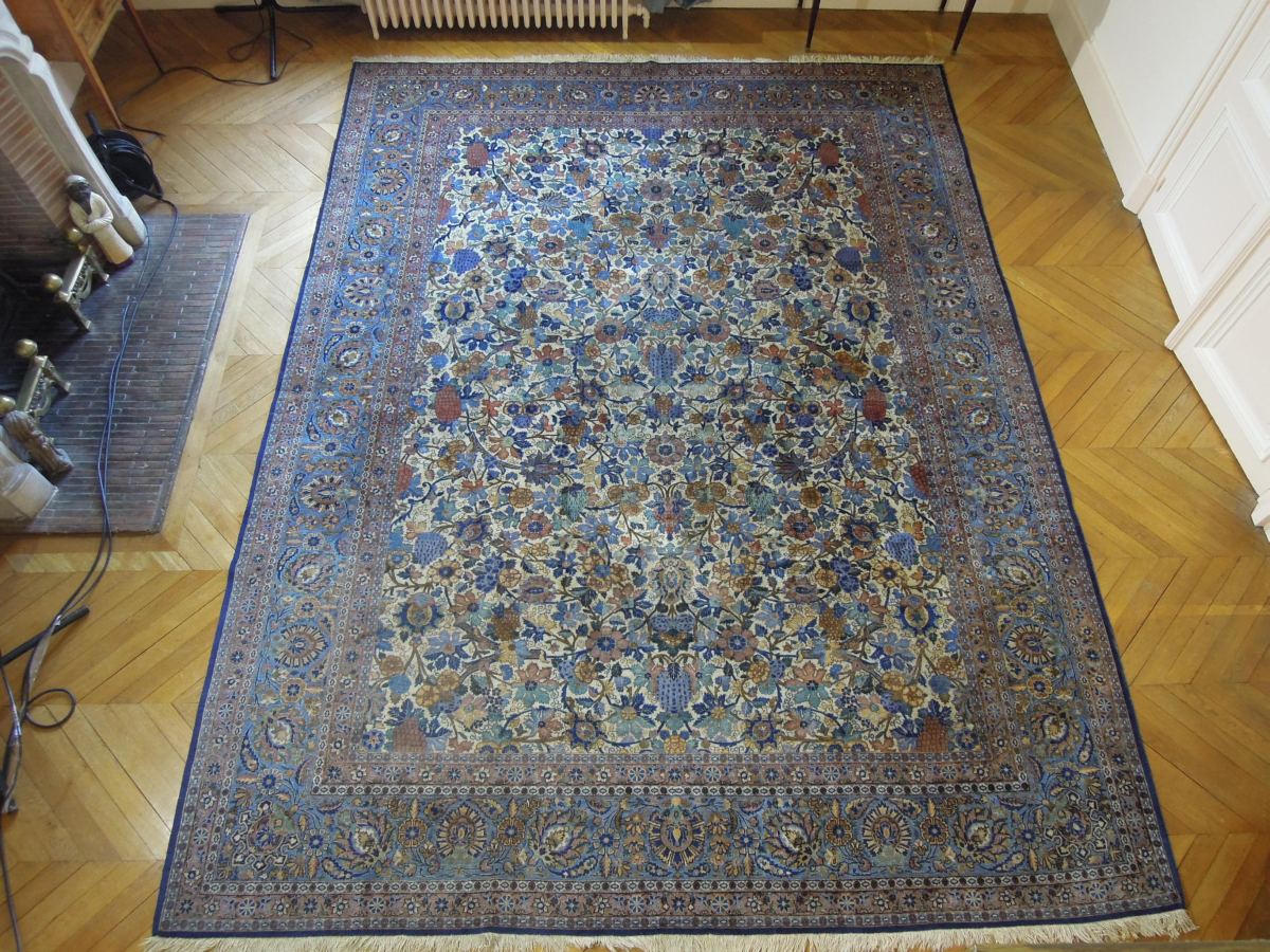 Tapis KESCHAN, Centre de la Perse, première moitié du XXème. Sur un fond ivoire, se détache un élégant décor floral stylisé. Une large bordure bleue à guirlande de fleurs cerne la composition.