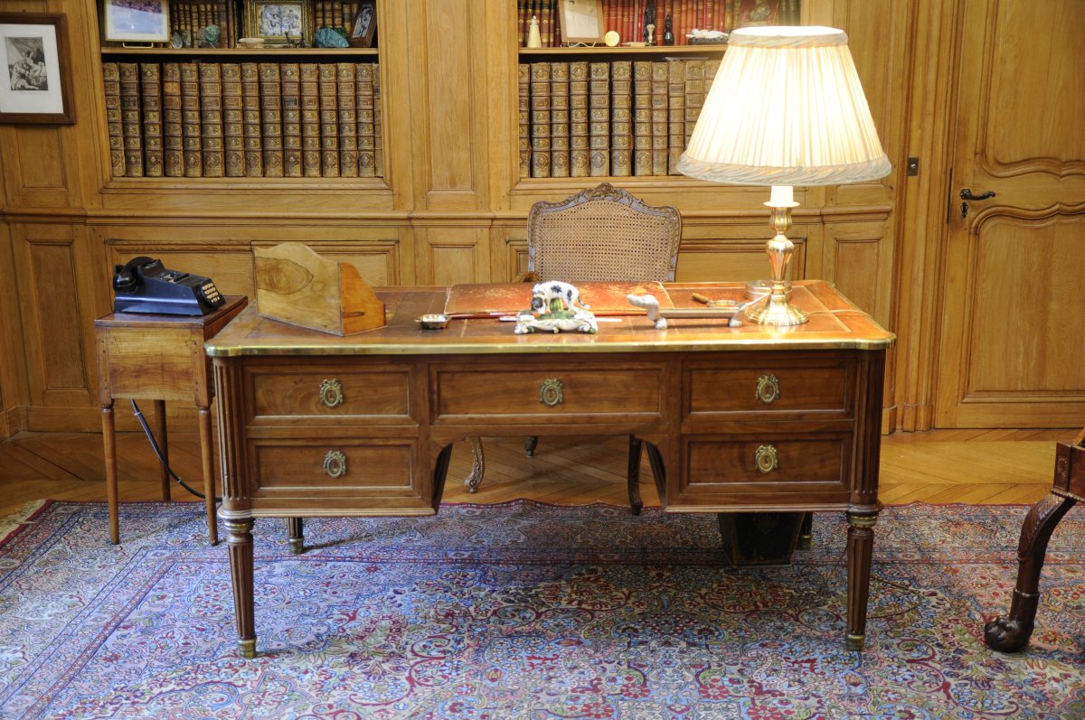 BUREAU À CAISSON en acajou et placage ouvrant à cinq tiroirs sur trois rangs, reposant sur quatre pieds cannelés, le dessus foncé d'un cuir fauve et contournée d'une baguette de laiton. Entrée de serrure, poignées de tirages et bagues de pied en bronze doré.