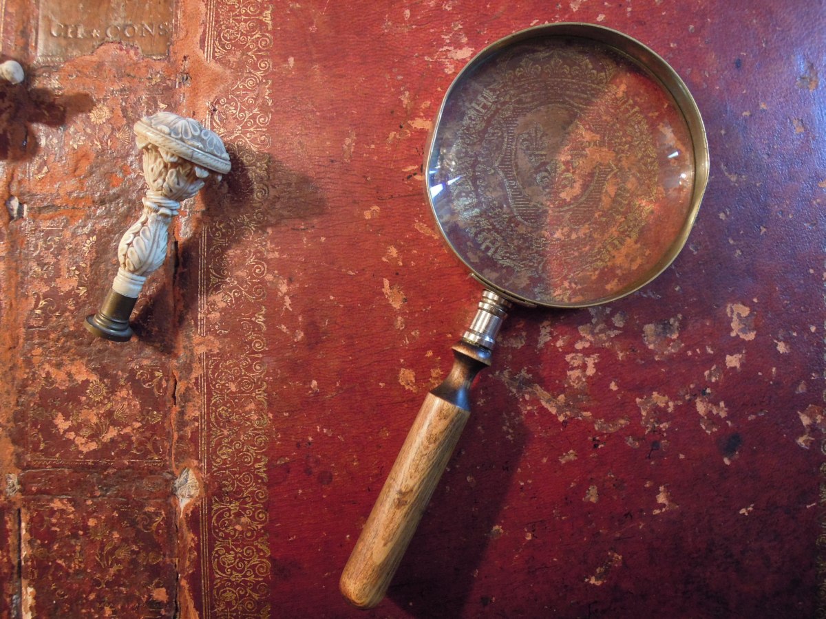 LOUPE ronde en laiton, verre et bois (Long. 21 cm), SOUS-MAIN en cuir