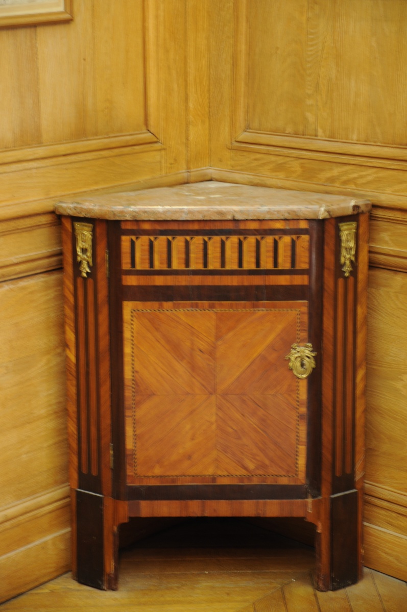ENCOIGNURE en placage de palissandre, de bois de rose et de violette ouvrant à une porte marquetée, les montants antérieurs à pans coupés simulant des colonnes triglyphes surmontés de chutes d'angle en bronze doré à motifs de chapiteaux corinthiens. Entrée de serrure en bronze doré à motif d'un médaillon fleuri. Dessus de marbre brèche. Estampillée "B VASSOU". Jean-Baptiste Vassou reçu maître en 1767.